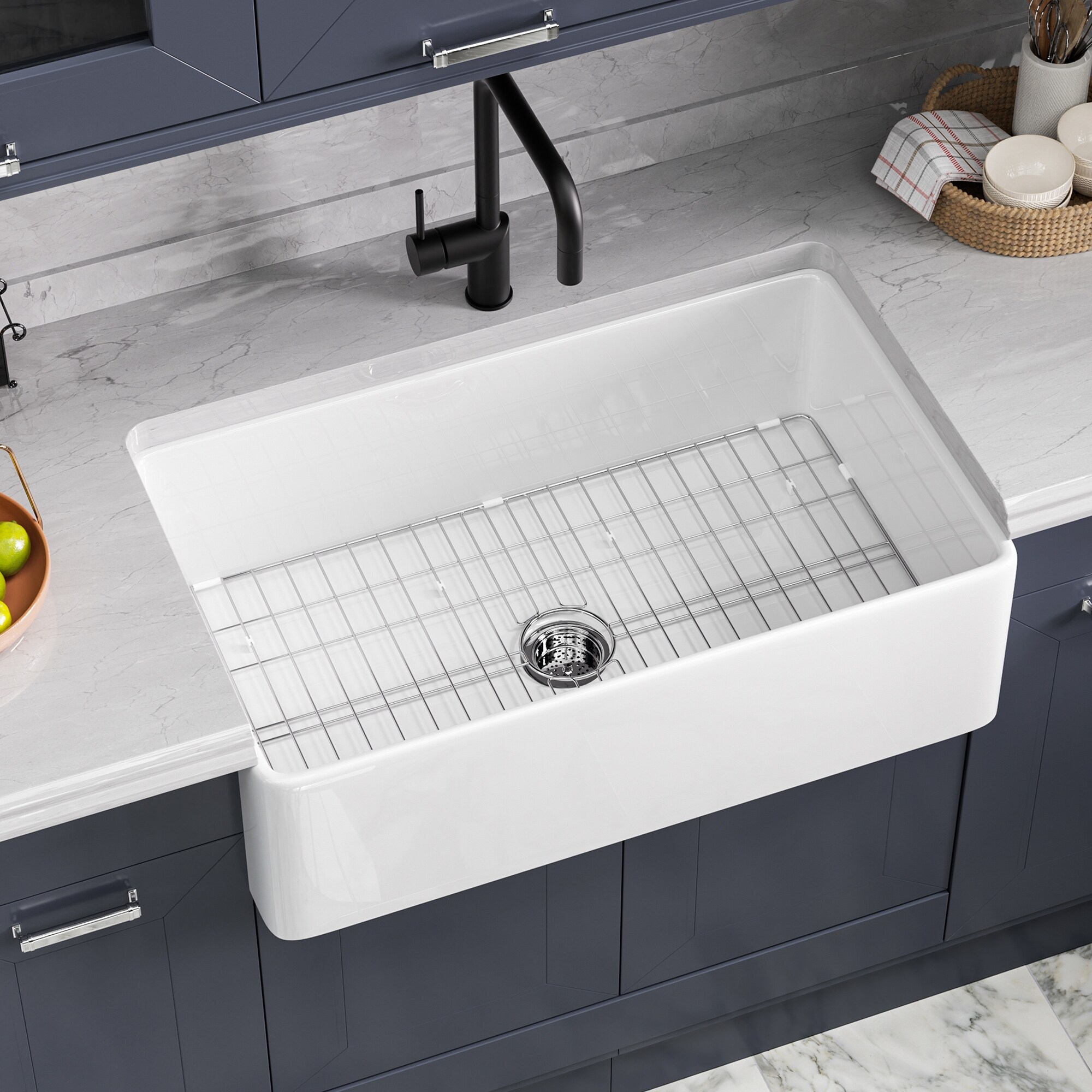 33" x 20" White Fireclay Single Bowl Farmhouse Apron Kitchen Sink With Grid - 31" 20"