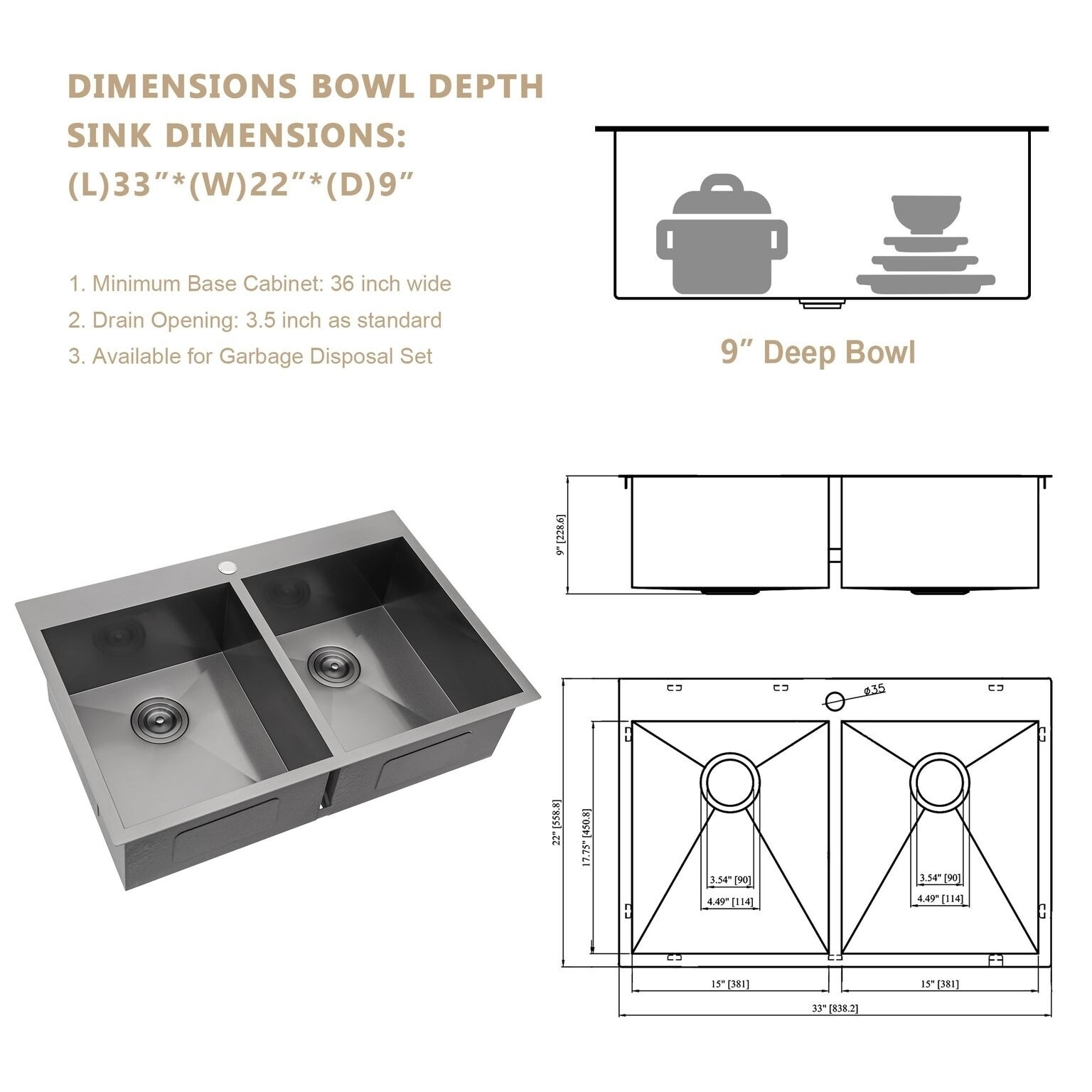 Kichae Black 33 Inch Double Bowl 18 Gauge Stainless Steel Kitchen Sink