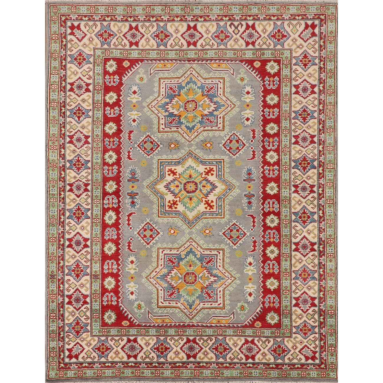 Gray Geometric Kazak Rug Hand-Knotted Oriental Wool Carpet - 5'1" x 6'9"