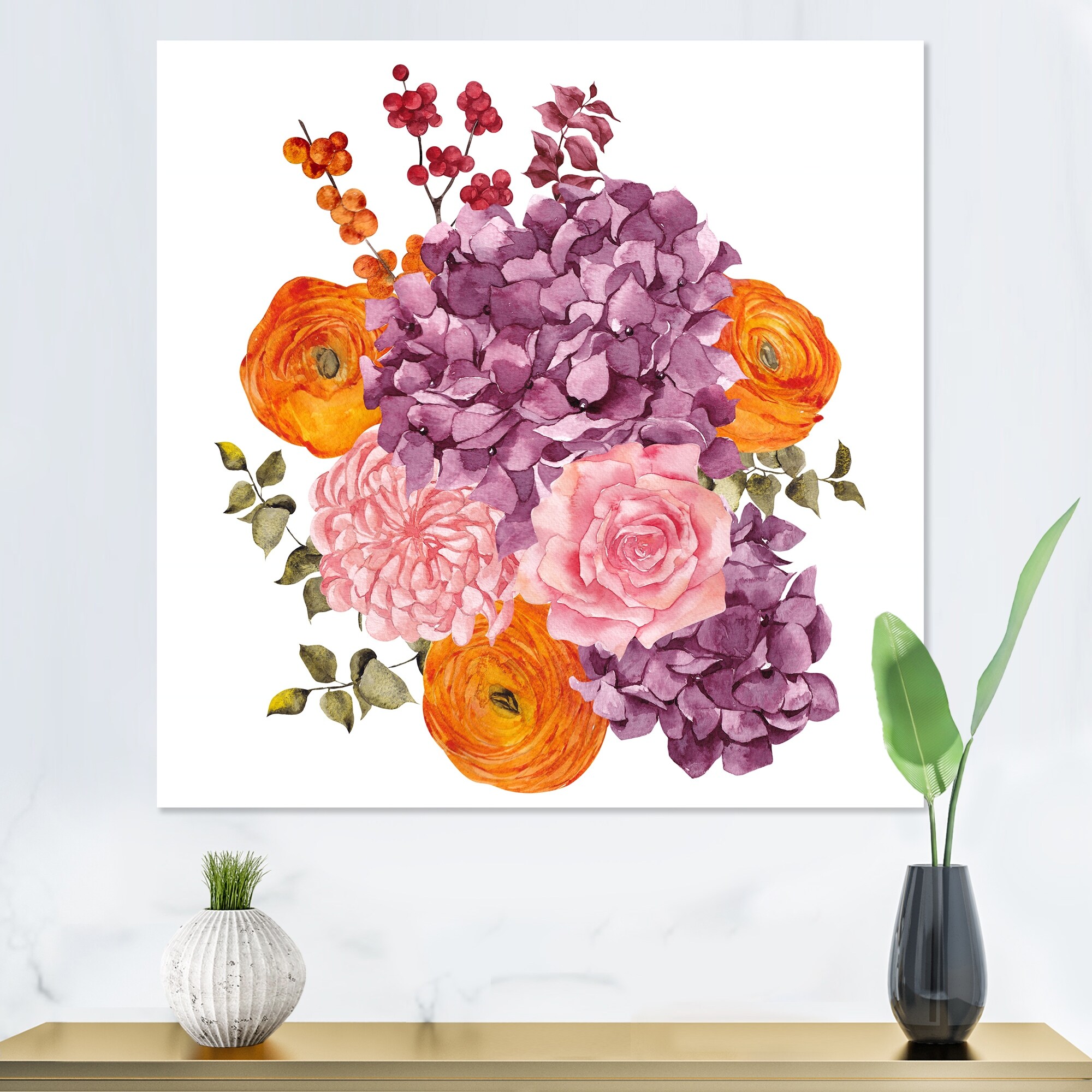 Designart "Fall Flower Bouquet, Apple Berries And Leaves VII" Traditional Canvas Wall Art Print