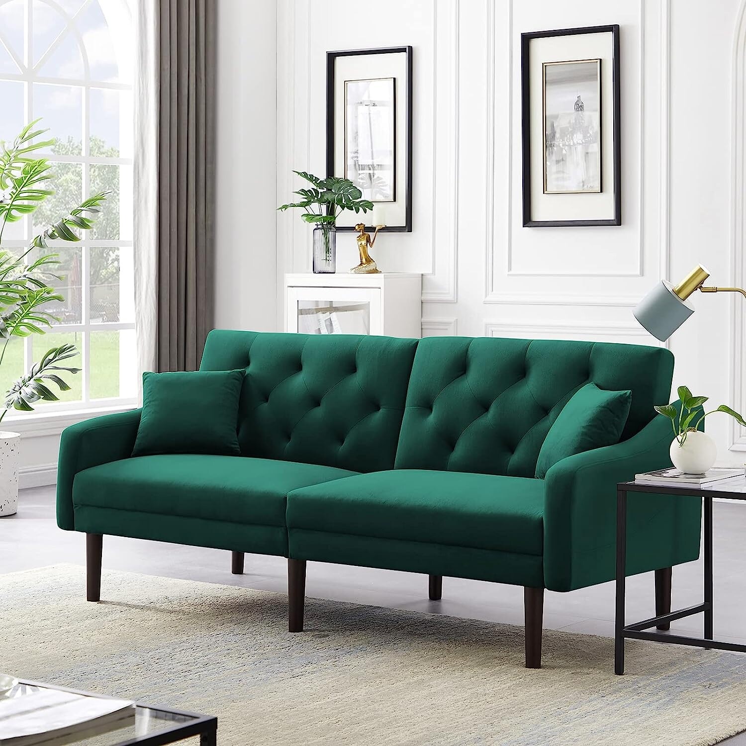 Modern Velvet Futon Sofa Bed with Armrests and 2 Pillows