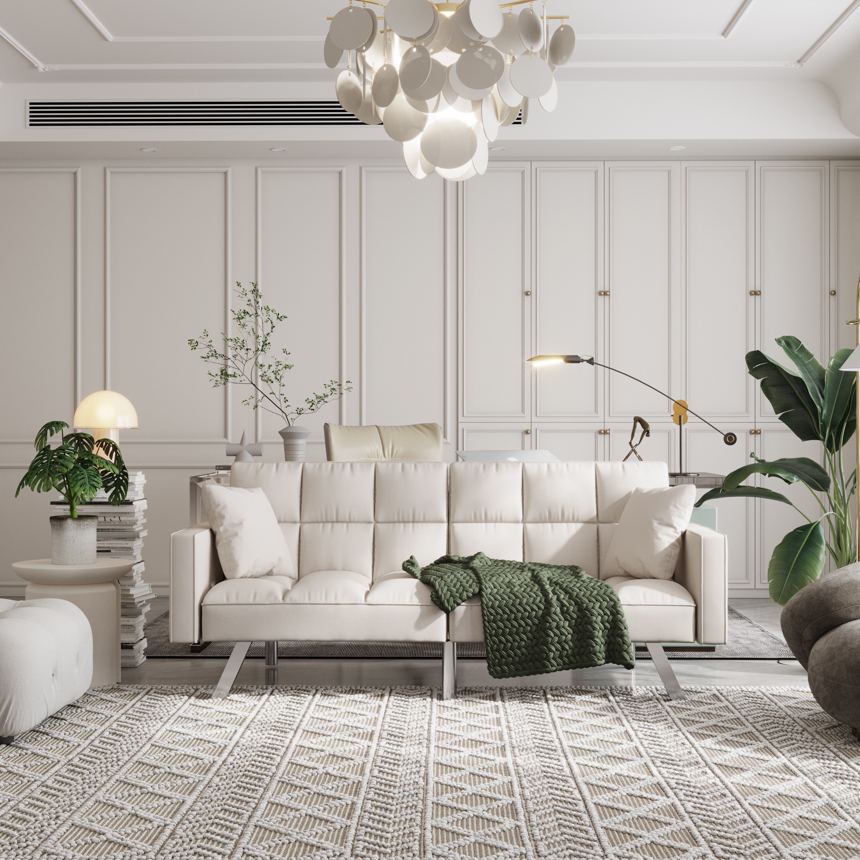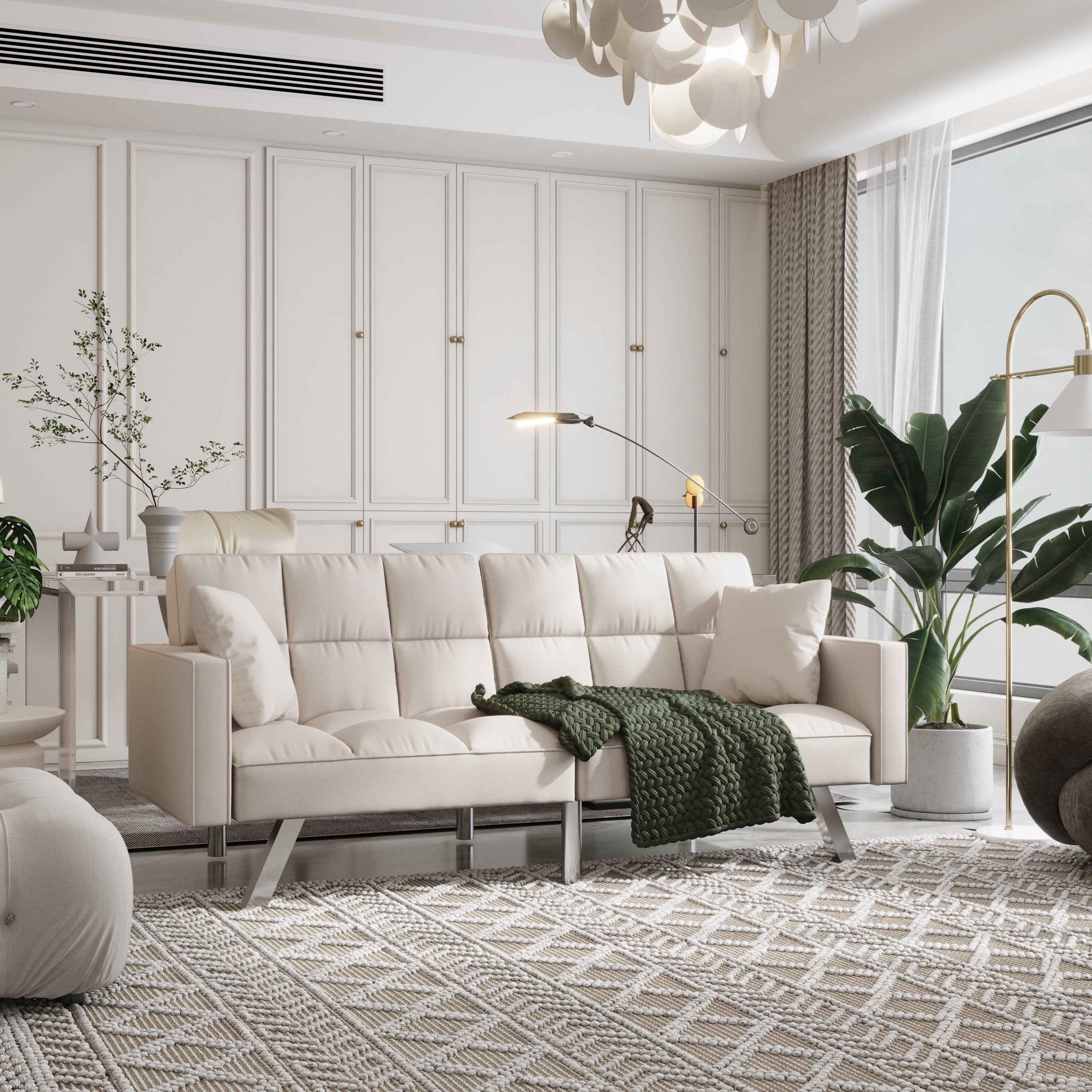 PU Upholstered Modern Convertible Folding Futon Sofa Bed Removable Armrests, Metal Legs, with 2 Cupholders