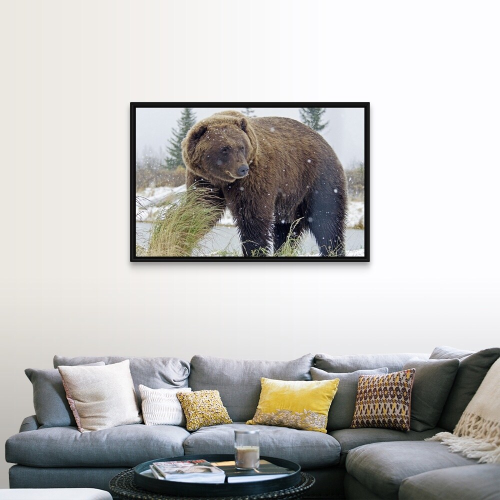 "Brown Bear in snowstorm" Black Float Frame Canvas Art
