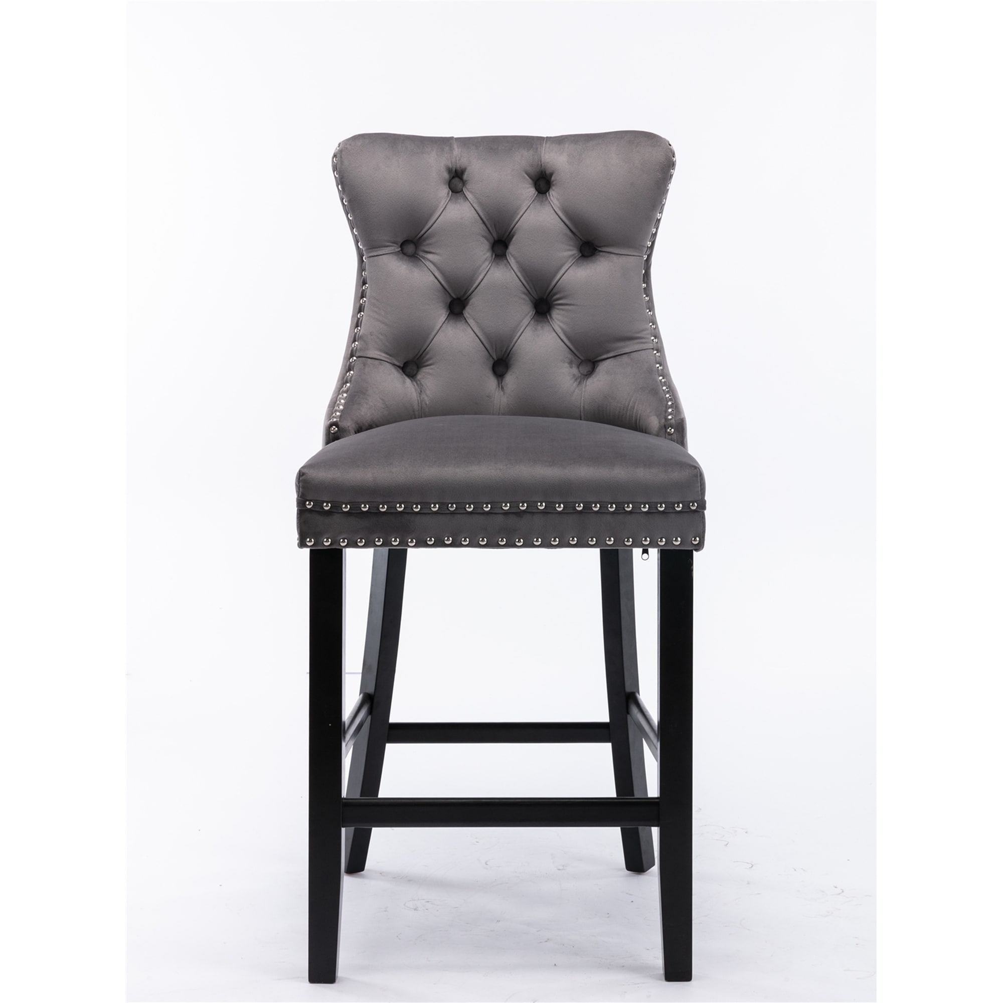 Modern Leisure Velvet Upholstered Barstools with Button Tufted Decoration and Wooden Legs, and Chrome Nailhead Trim, Set of 2