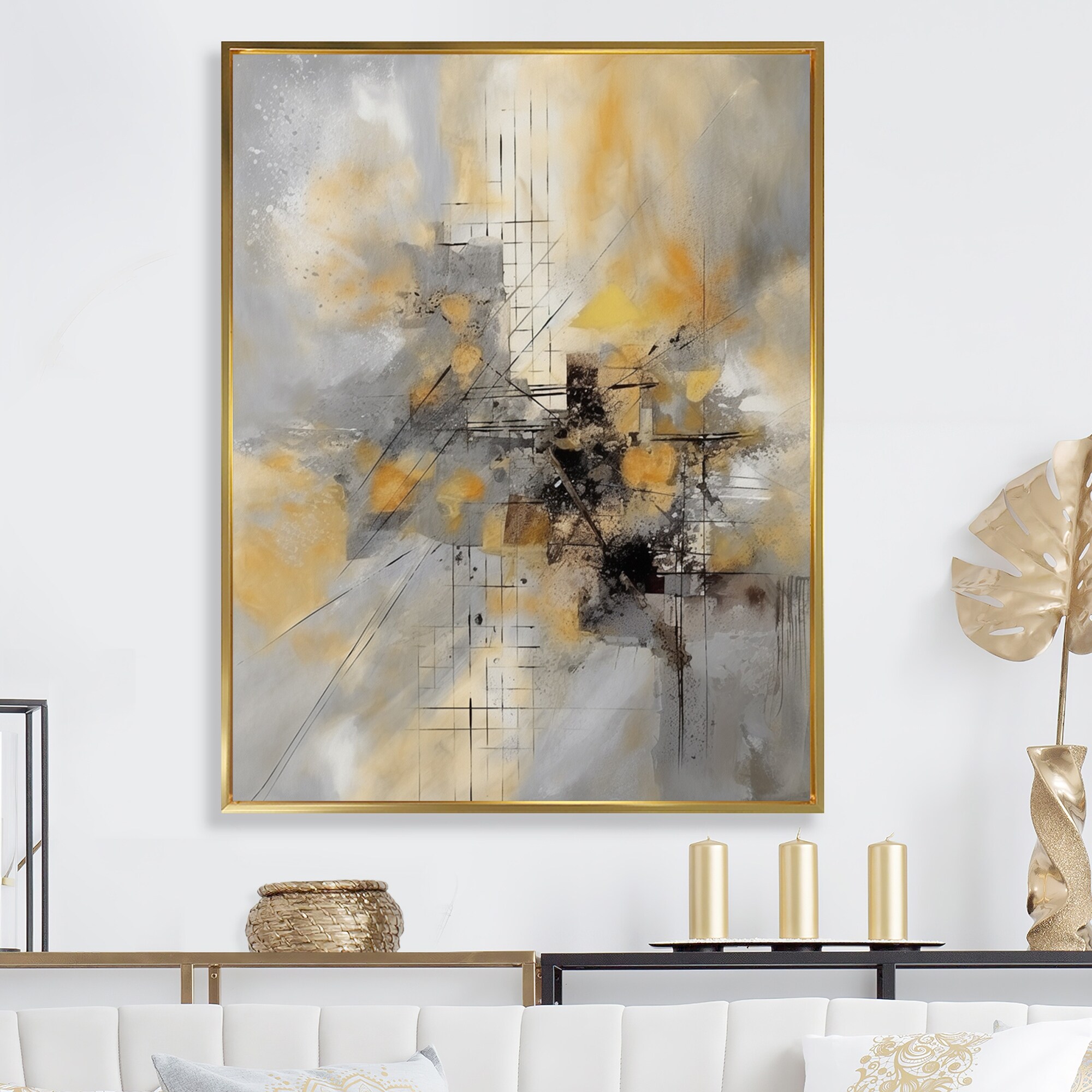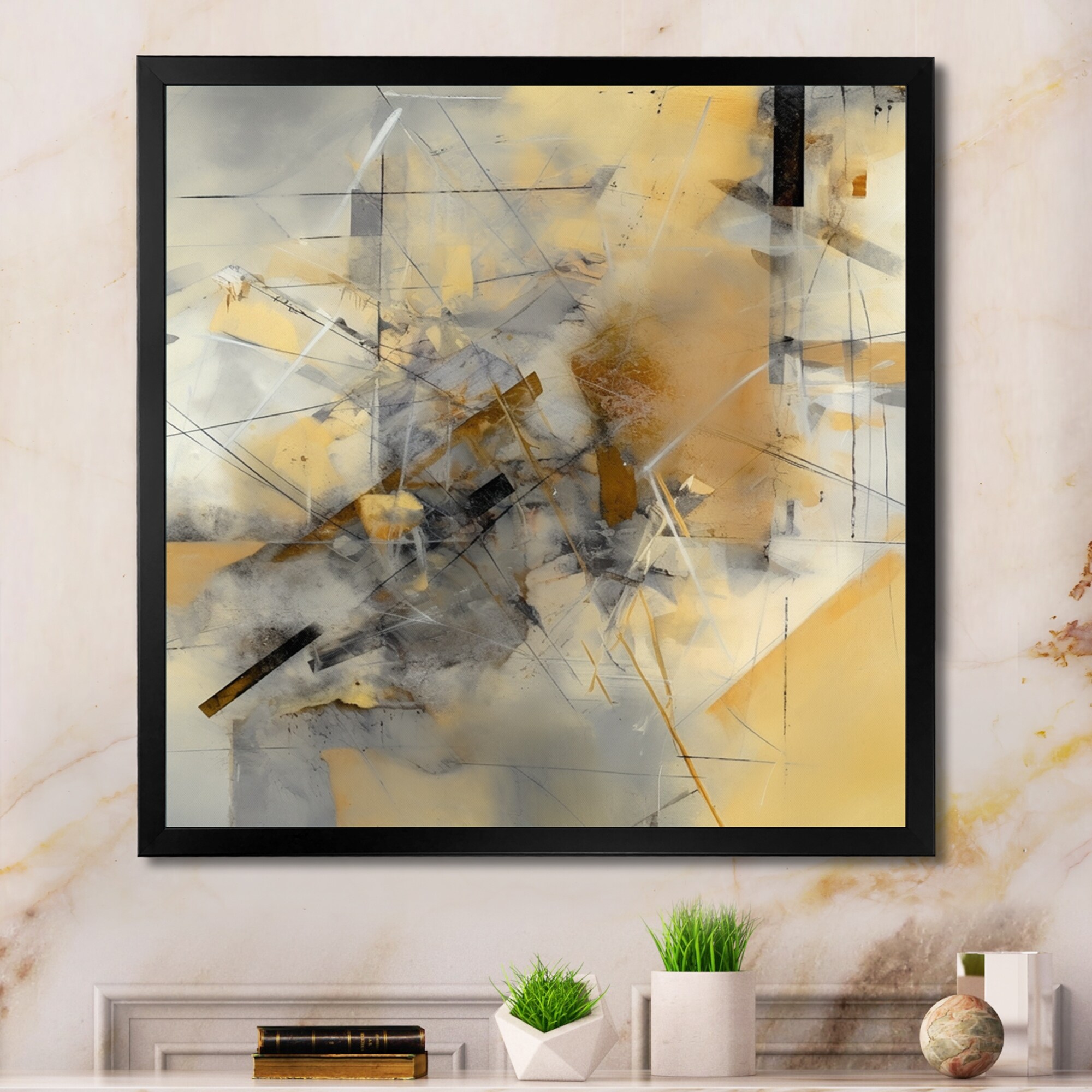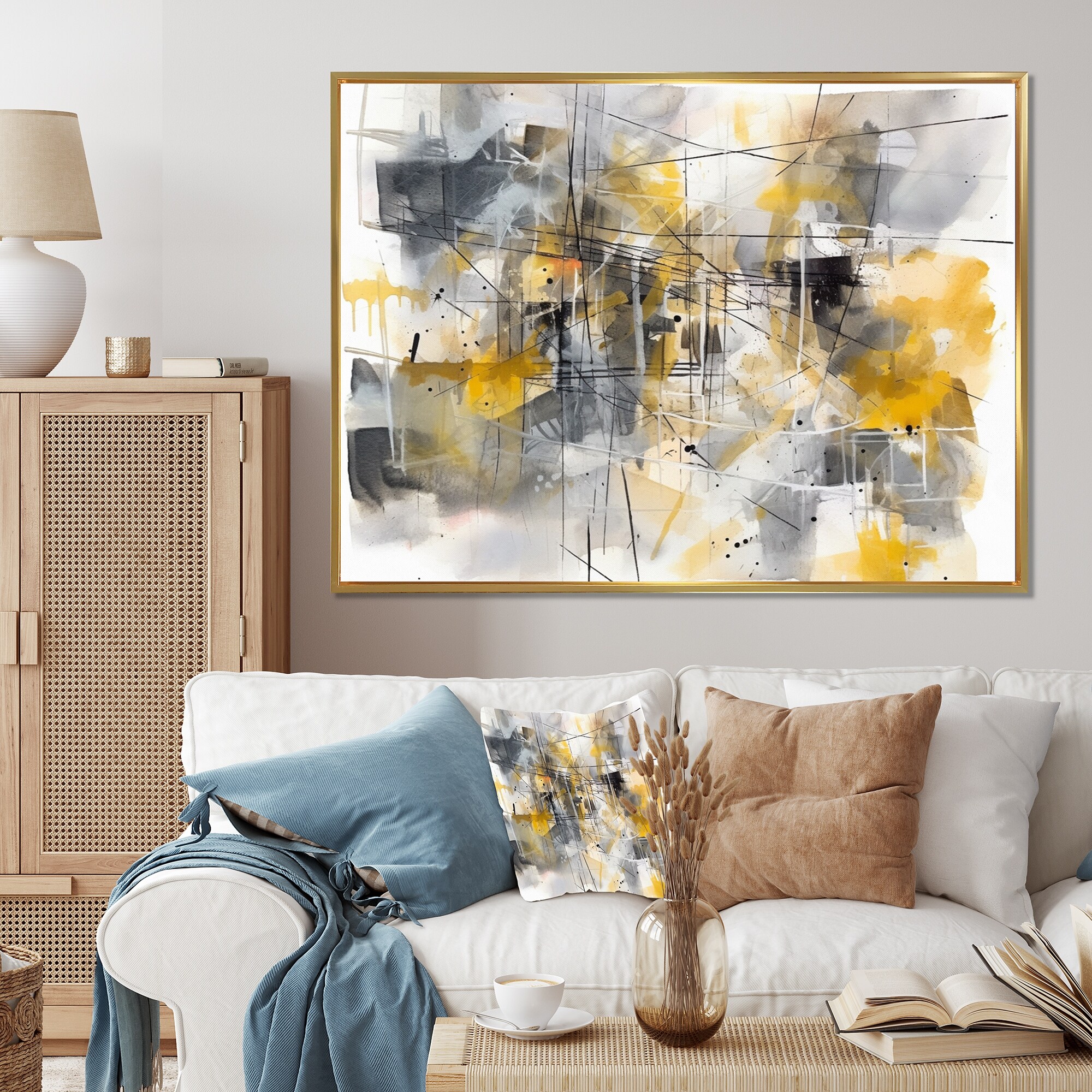 Designart "Yellow And Grey Beyond the Canvas V" Abstract Painting Framed Wall Art for Living Room