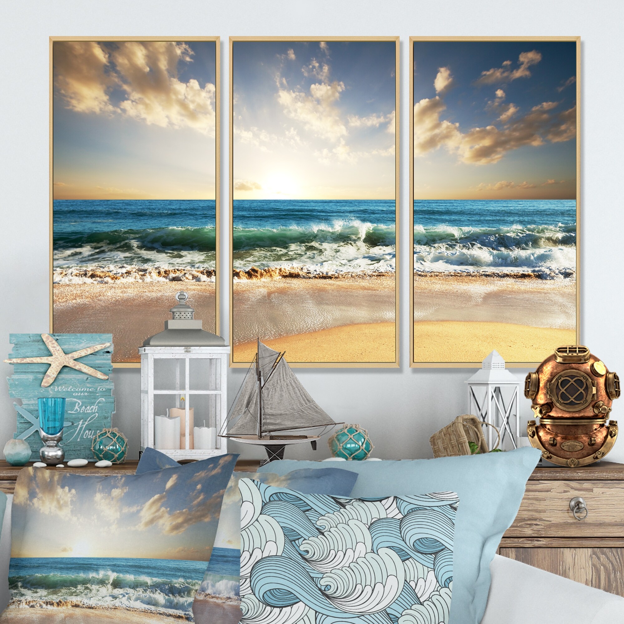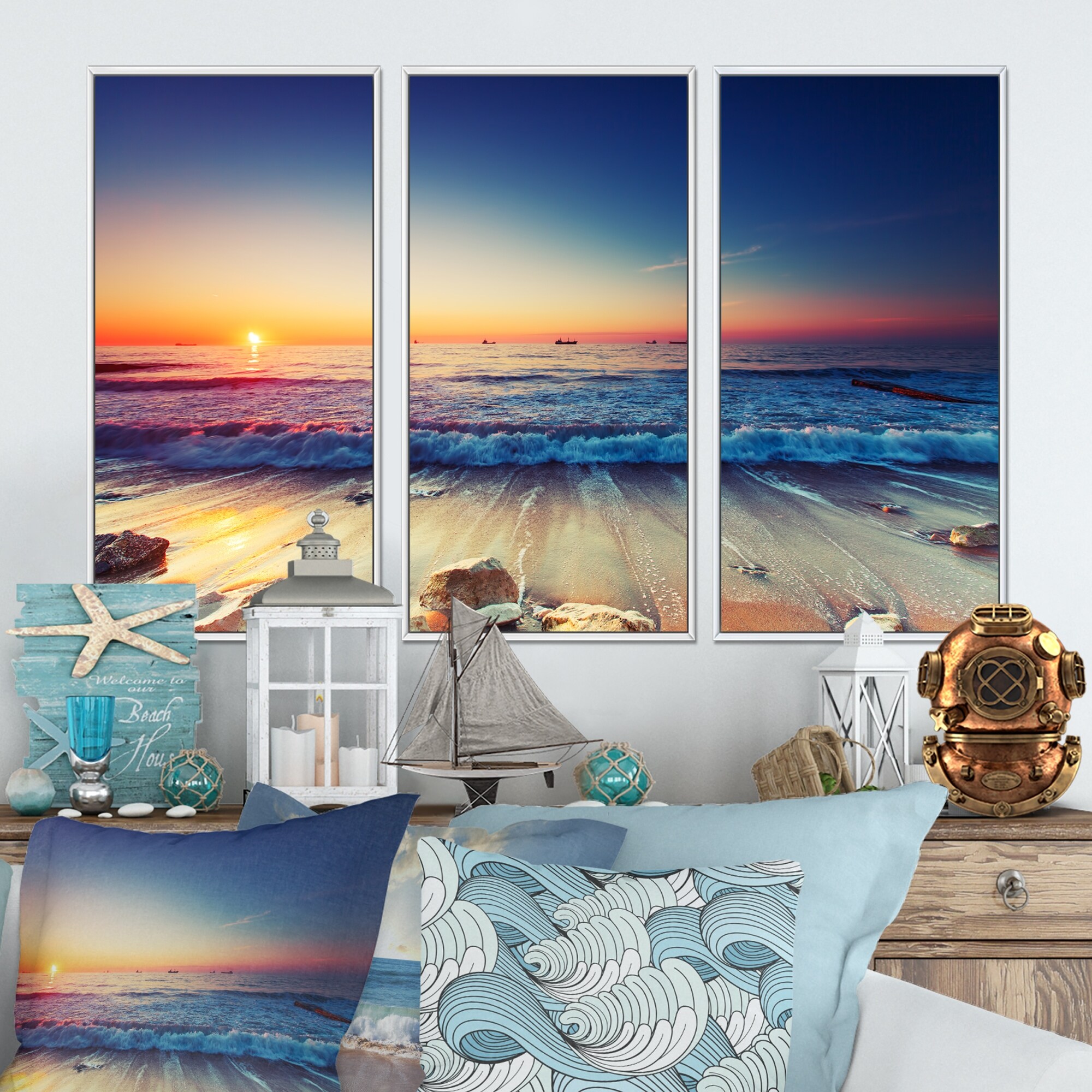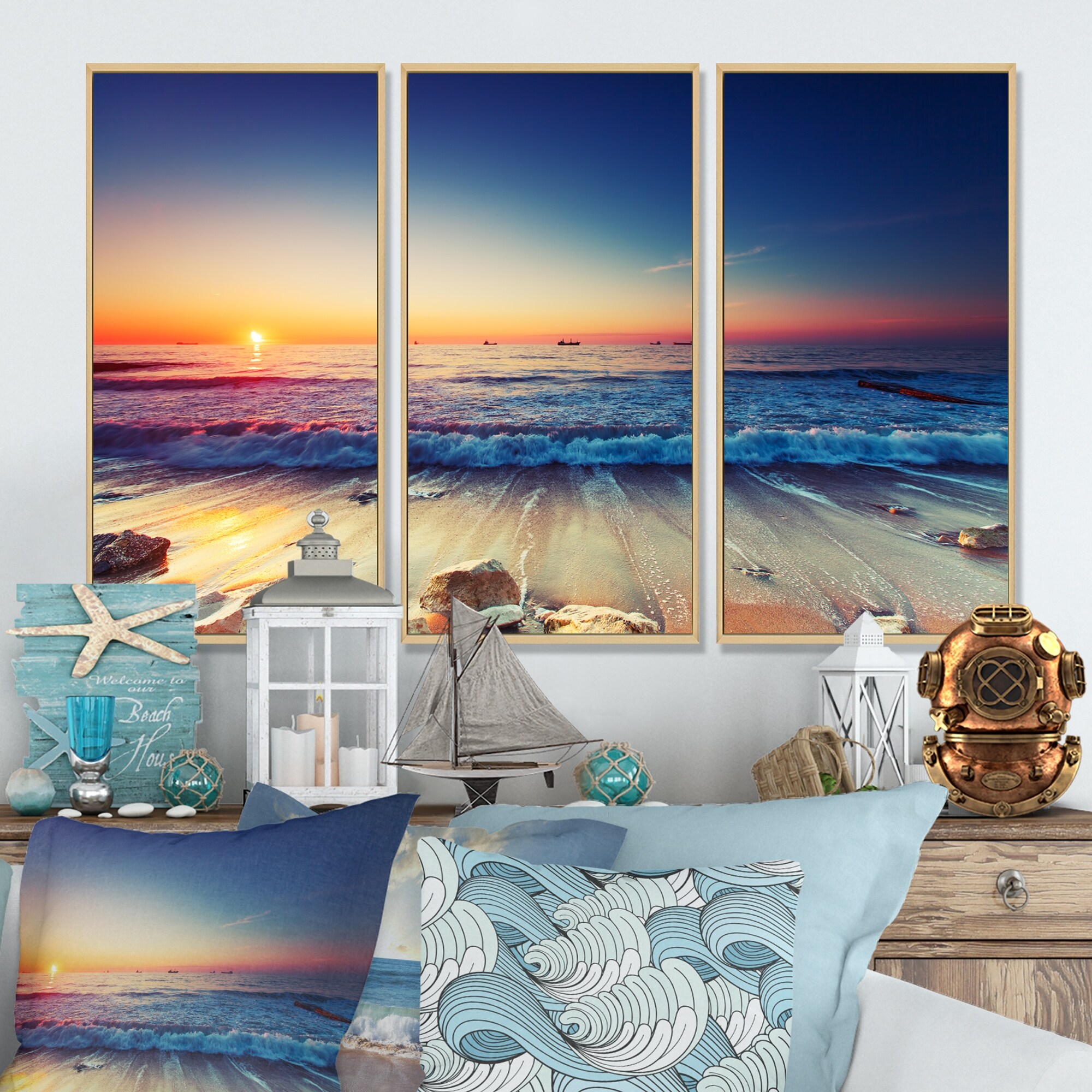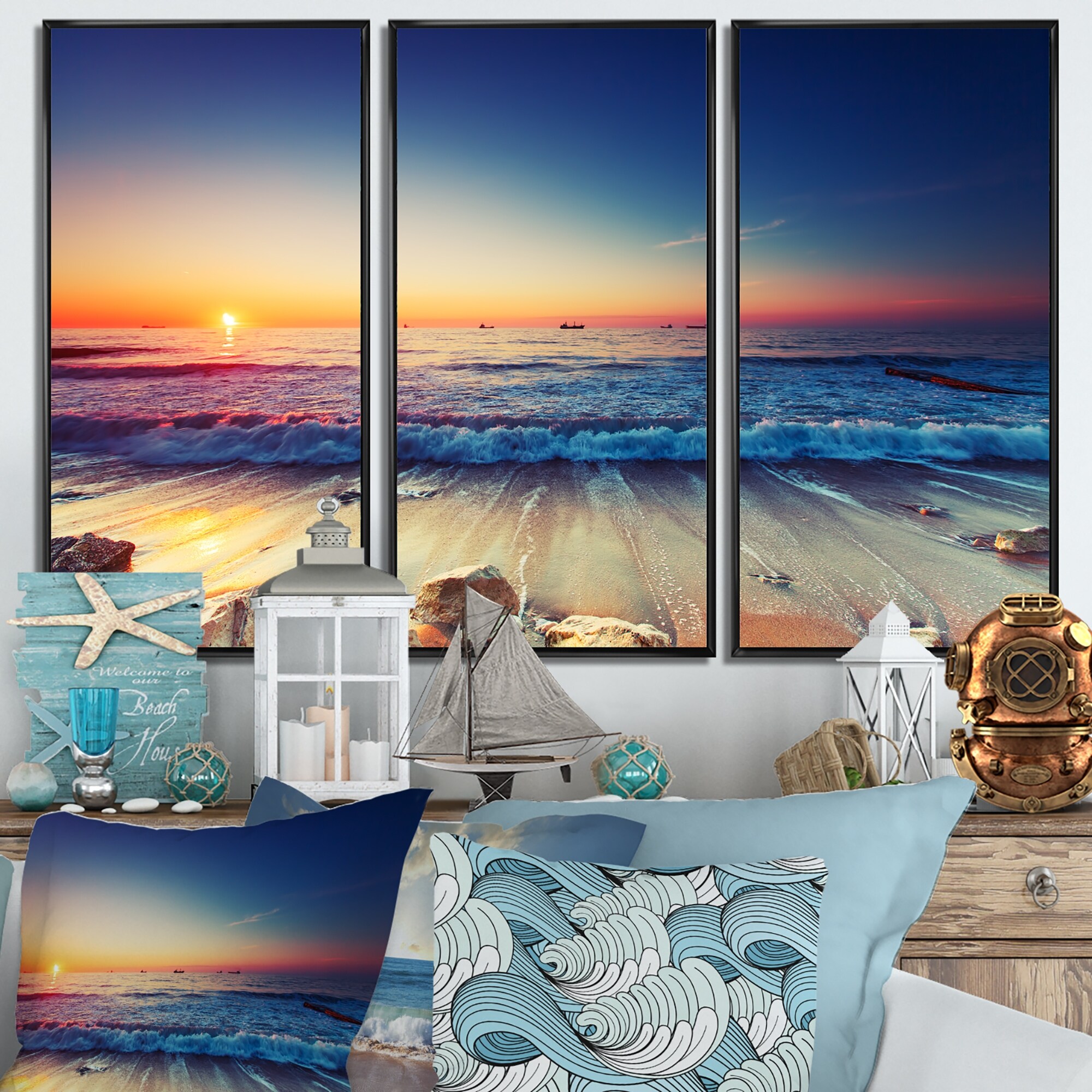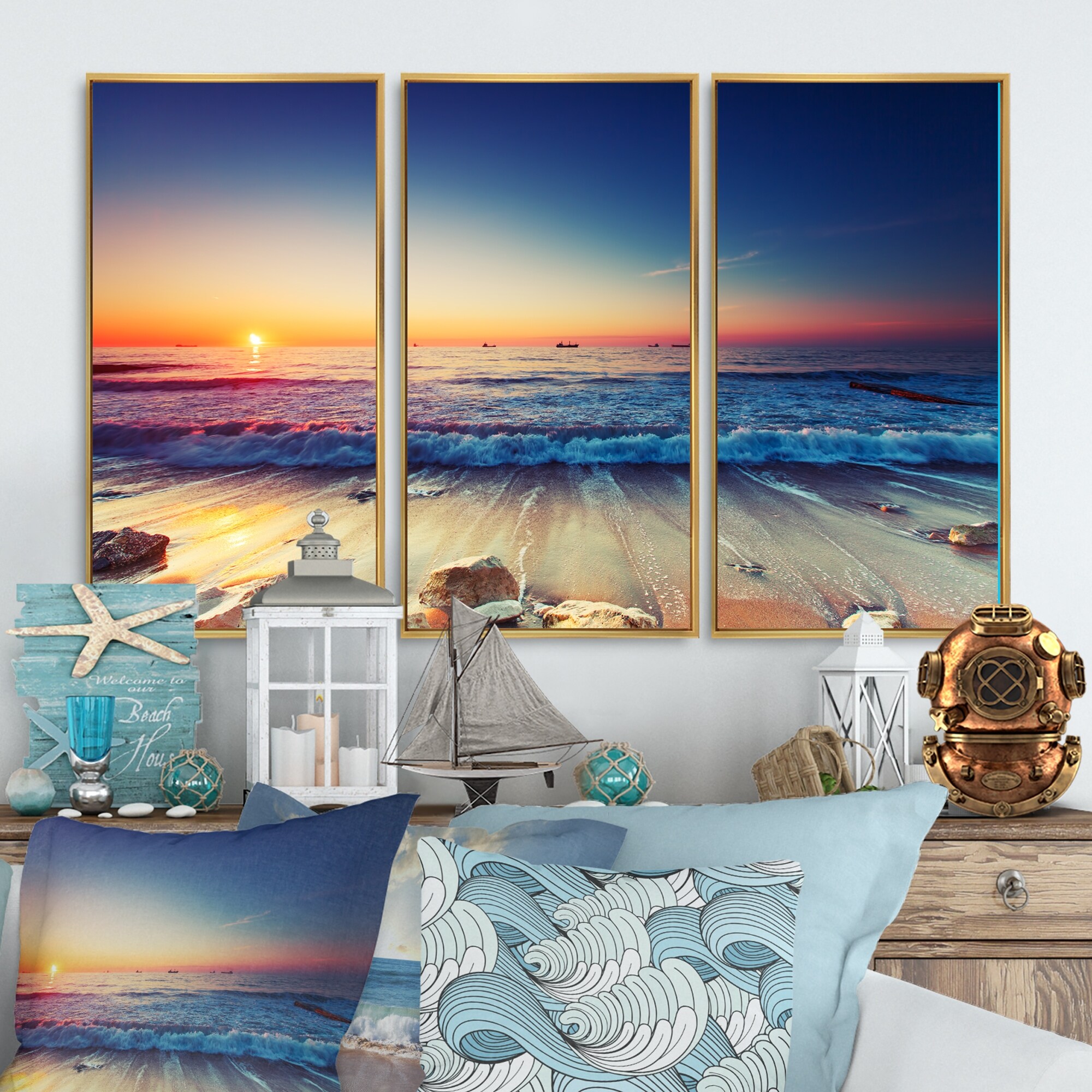 Designart "Beautiful Sunrise over Blue Sea" Sea & Shore Framed Canvas Wall Art Set of 3 - 4 Colors of Frames