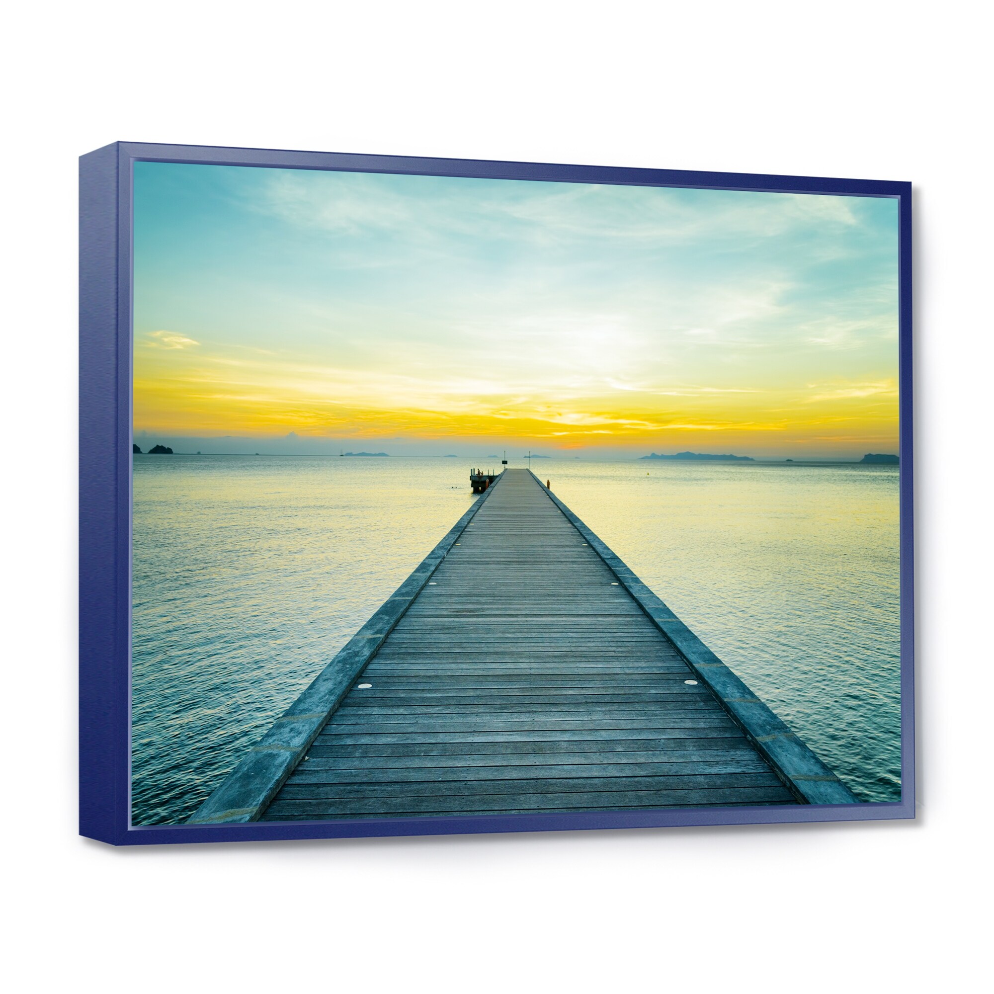 Designart "Wood Pier into the Yellow Blue Sea" Wooden Sea Bridge Framed Canvas Wall Art
