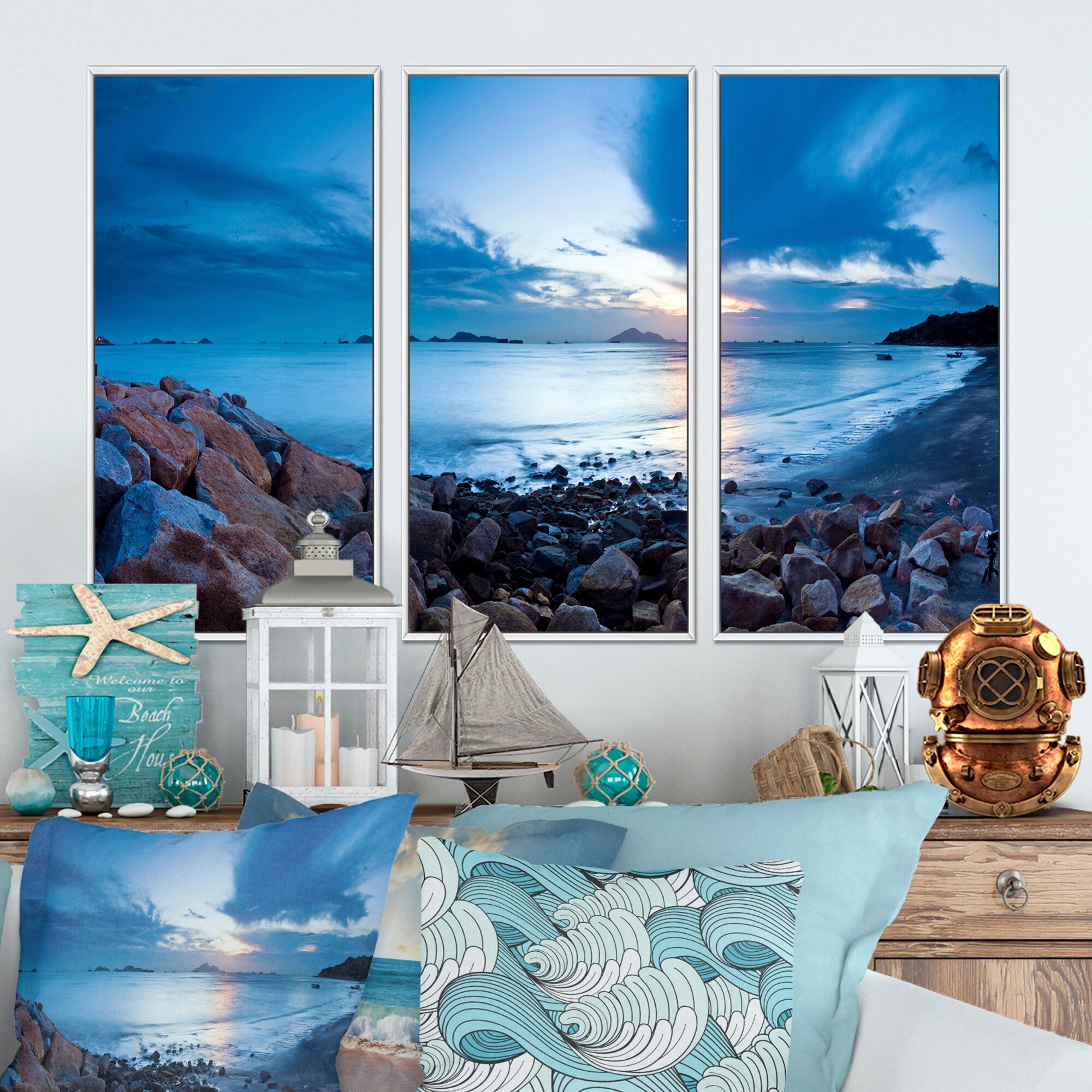 Designart "Blue Sea Sunset on Sandy Coastline" Sea & Shore Framed Art Prints Set of 3 - 4 Colors of Frames