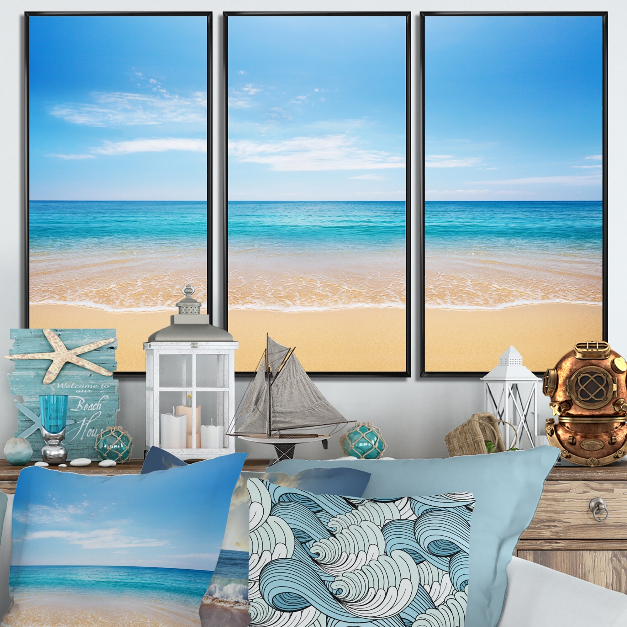 Designart "Bright Sky and Blue Sea" Sea & Shore Framed Canvas Wall Art Print Set of 3 - 4 Colors of Frames