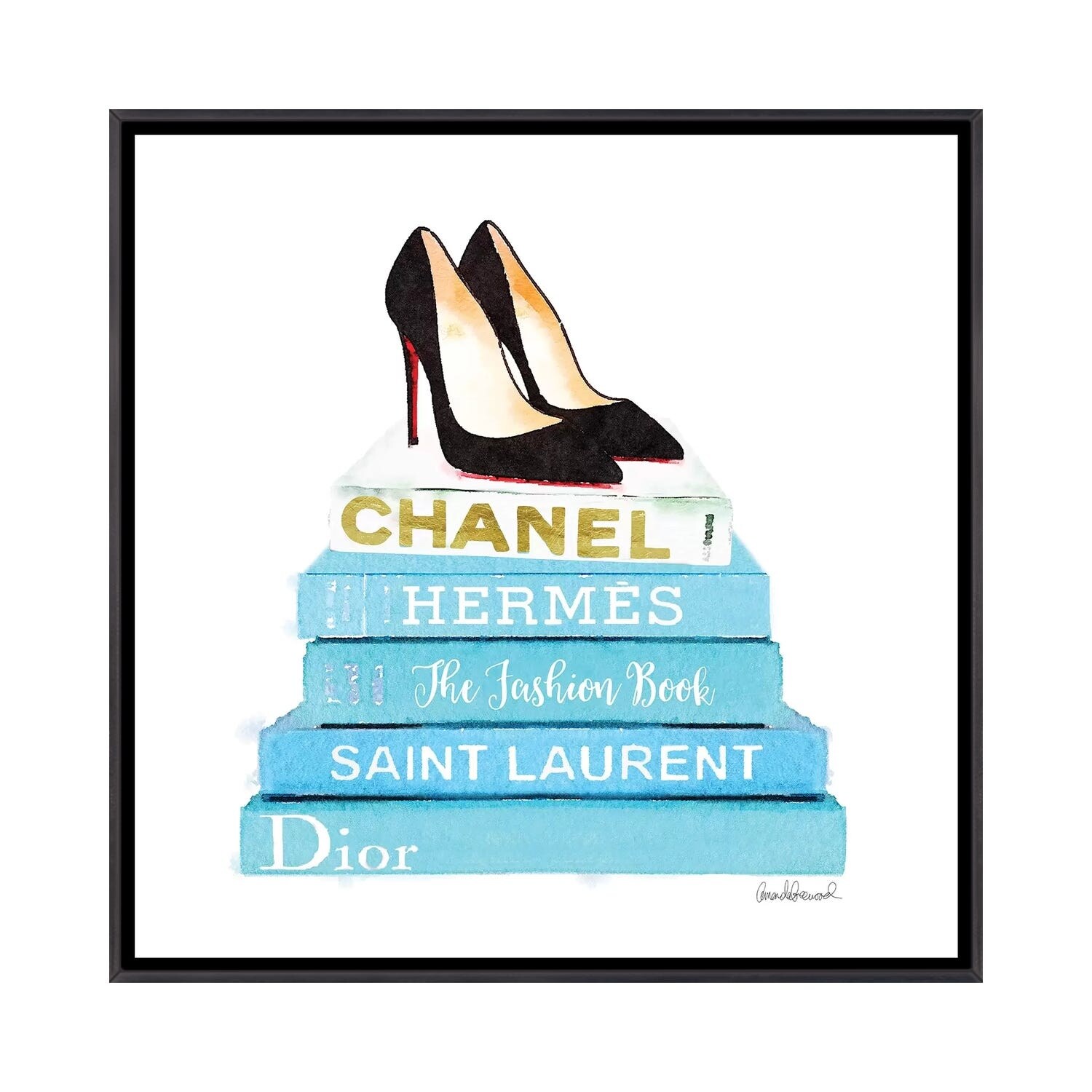 iCanvas "Stack Of Teal Fashion Books With Shoes" by Amanda Greenwood Framed
