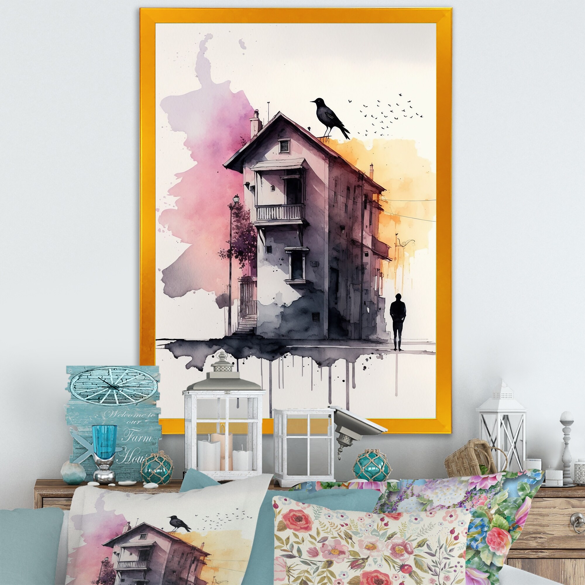 Designart "Little House in the Countryside With Pink Cloud II" Lake House Cottage Framed Canvas Wall Art Print