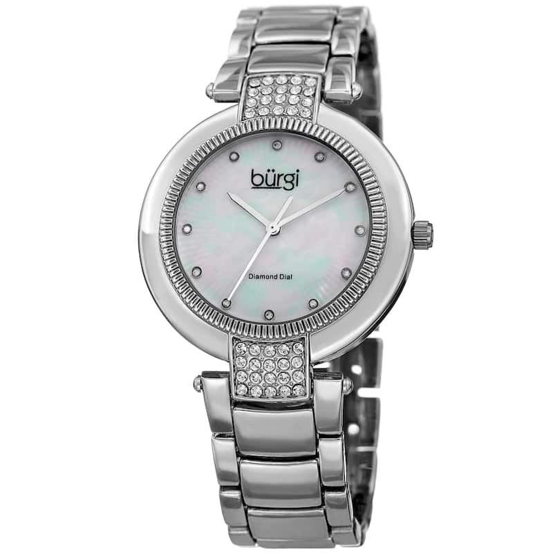 Burgi Women's Diamond Coin Edge Dial Crystal Lugs Silver-tone Bracelet Watch