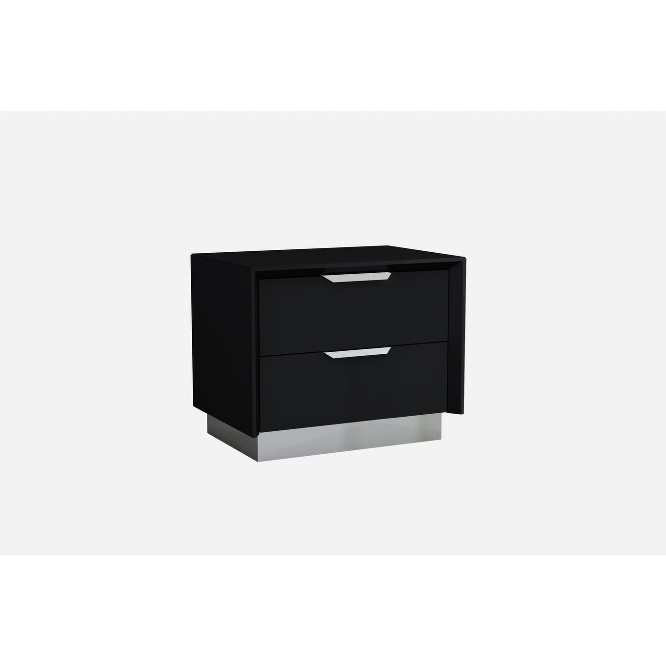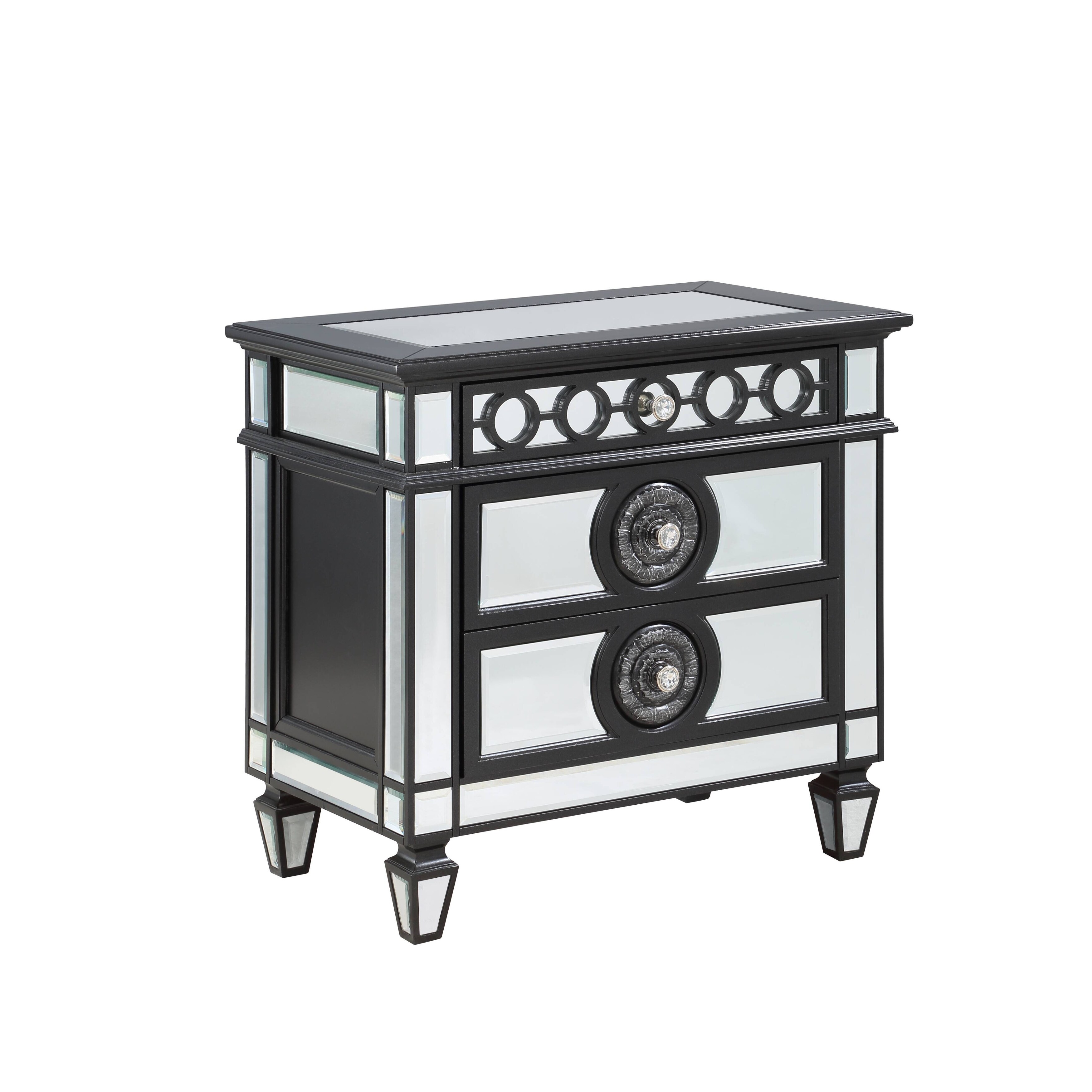 Black Velvet & Silver Finish Nightstand with Mirrored Top, Geometric Trim, and 2 Drawers