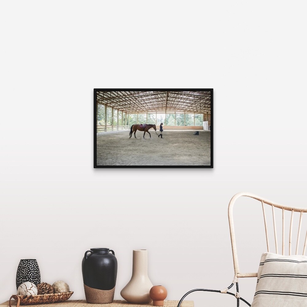 "Female equestrian walking horse in training arena" Black Float Frame Canvas Art
