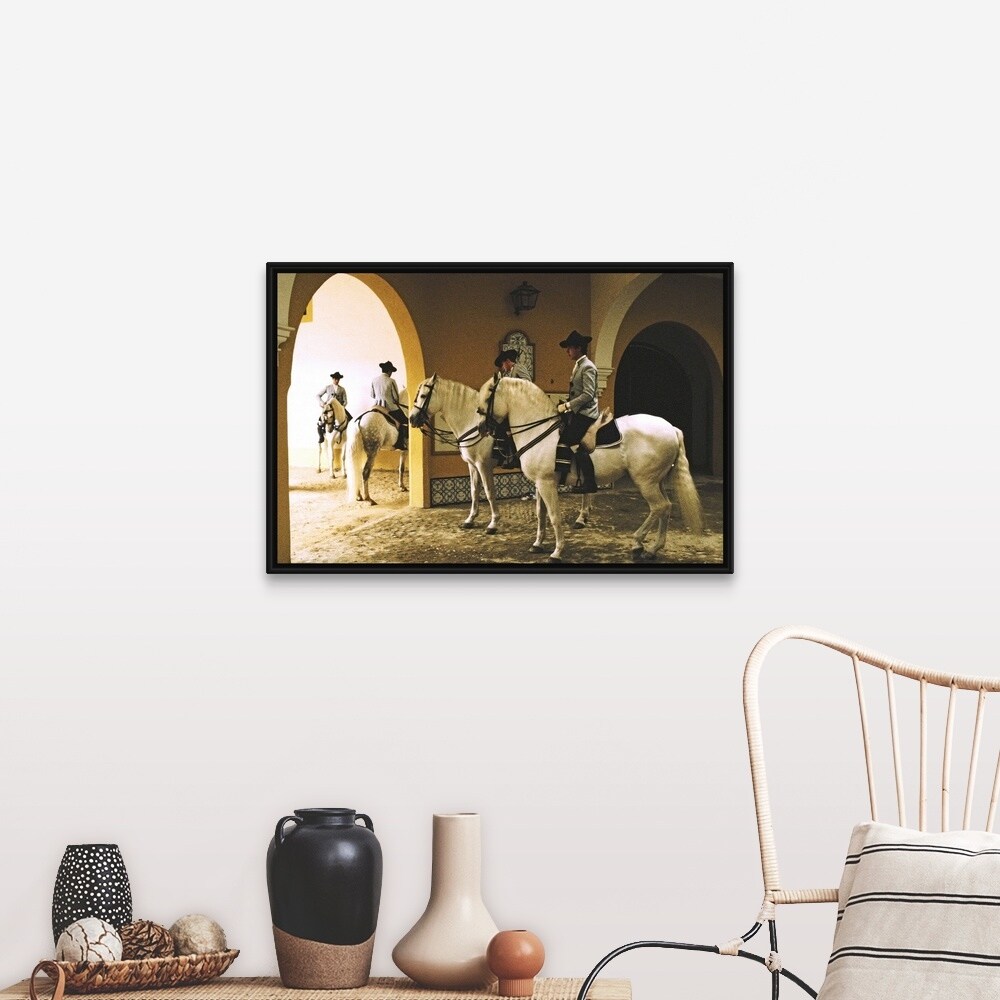 "Spain, Jerez de la Frontera, School of Equestrian Art, four men on horses" Black Float Frame Canvas Art