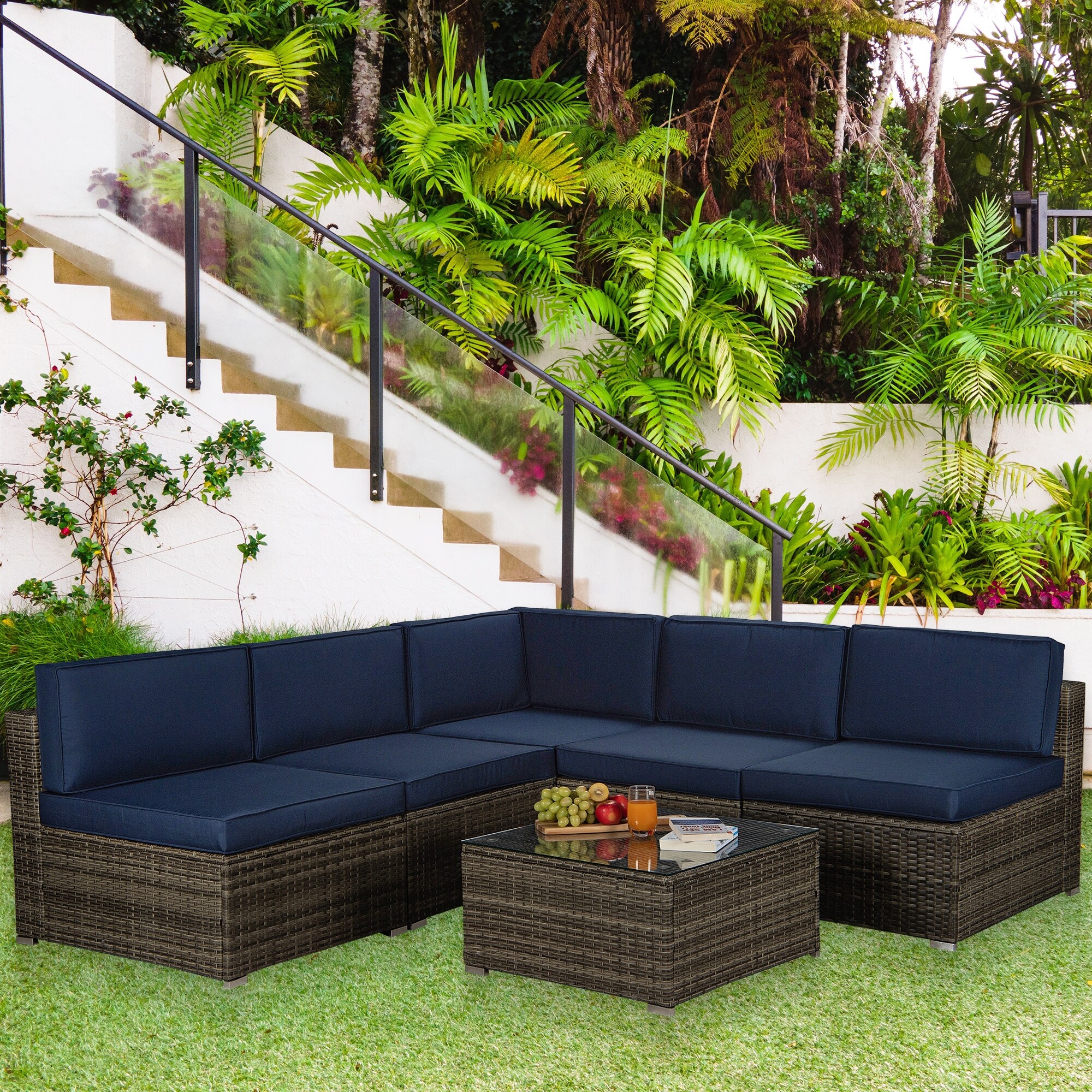 6-Piece Patio Furniture Set Outdoor Sectional Sofa with Glass Table