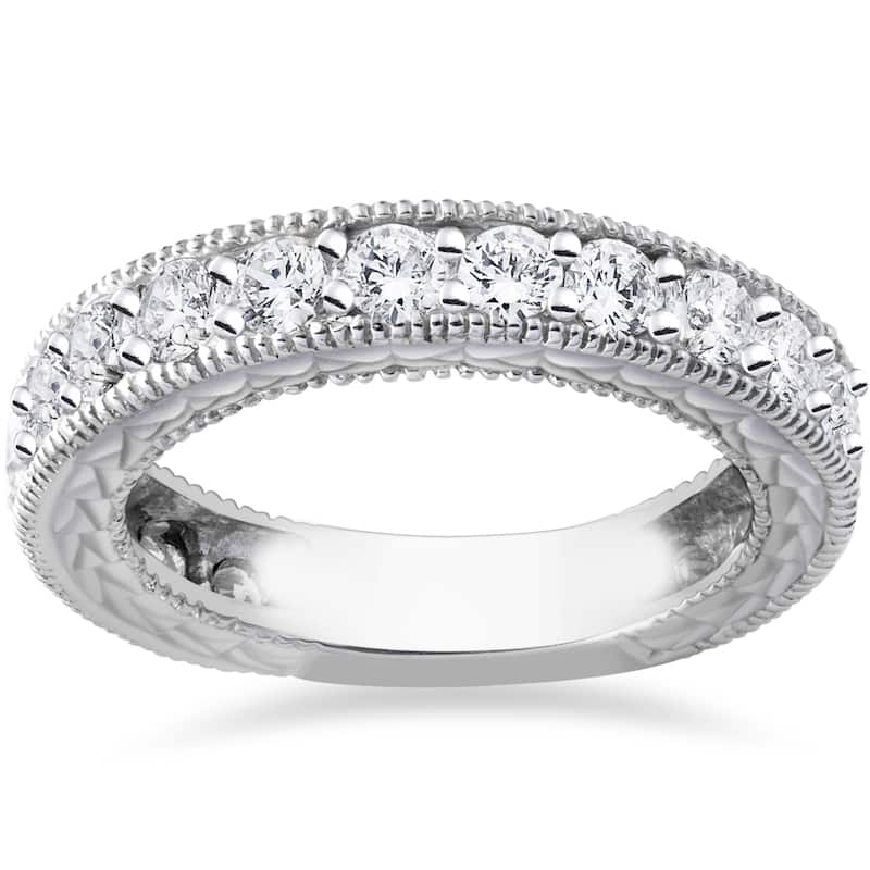 14k White Gold 1 3/8ct TDW Diamond Vintage Hand Engraved Stackable Wedding Ring