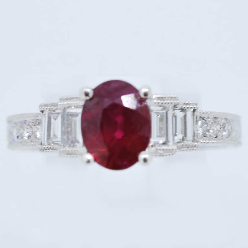 Kabella 18k White Gold Ruby and Baguette Diamond Gemstone Engagement Ring - Red