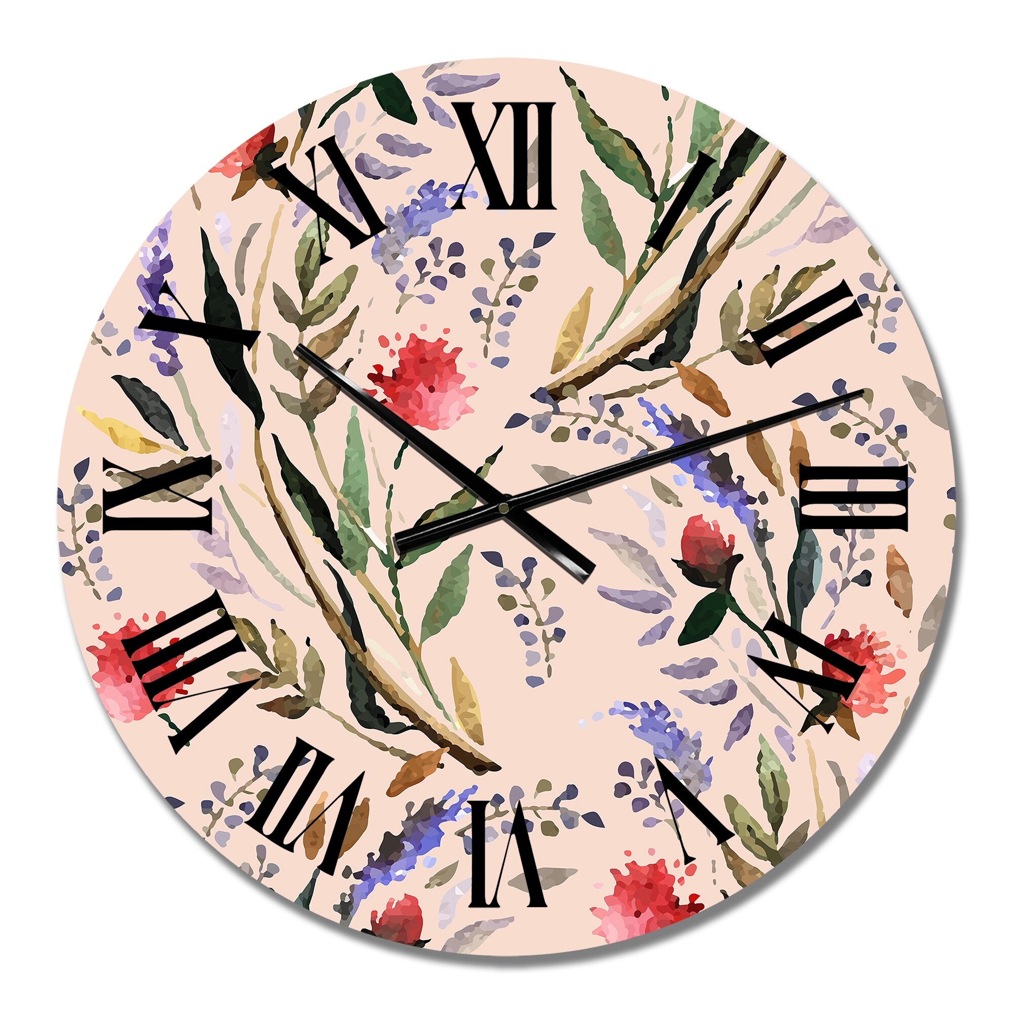 Designart 'Little Red Vintage Flowers And Herbs on Pink' Patterned wall clock