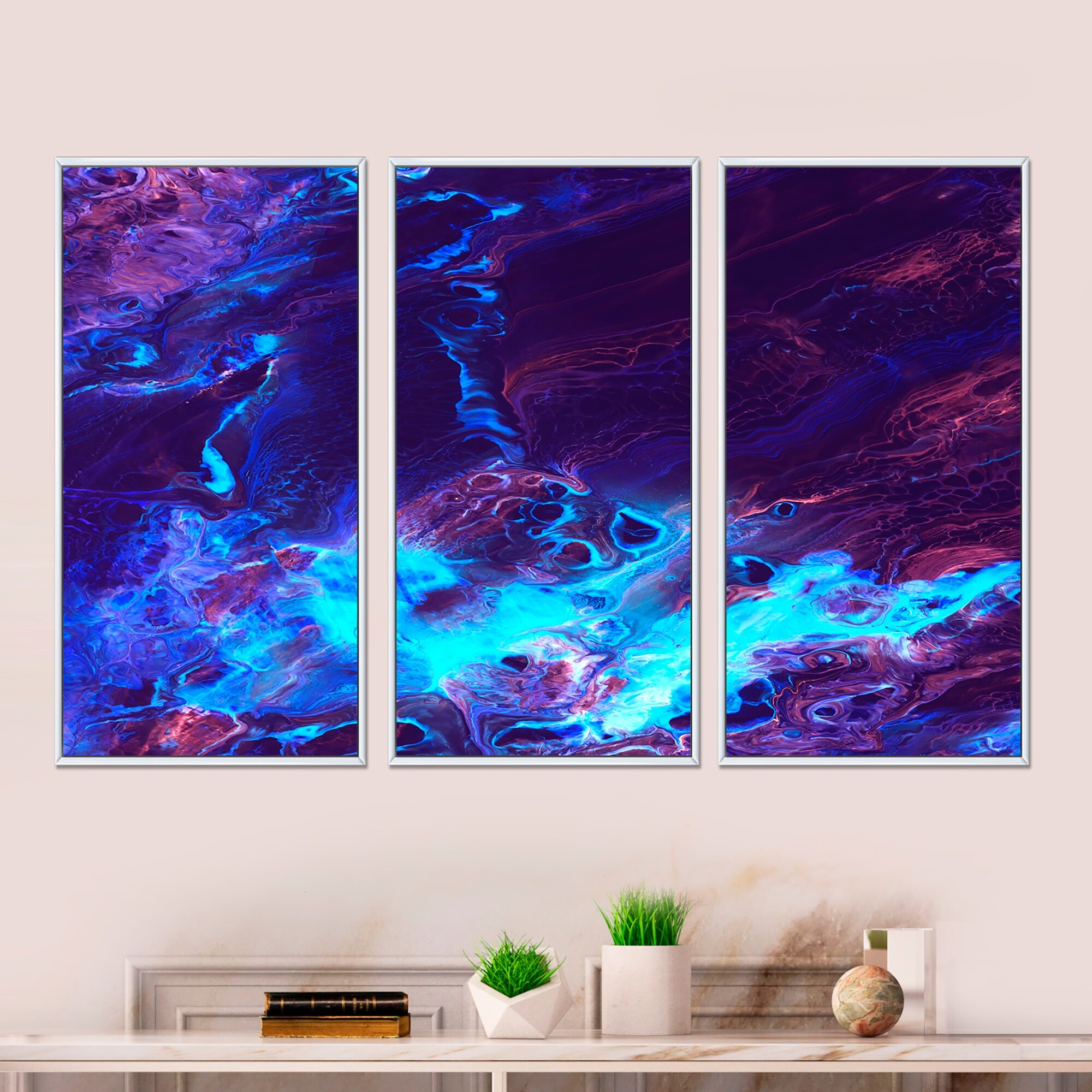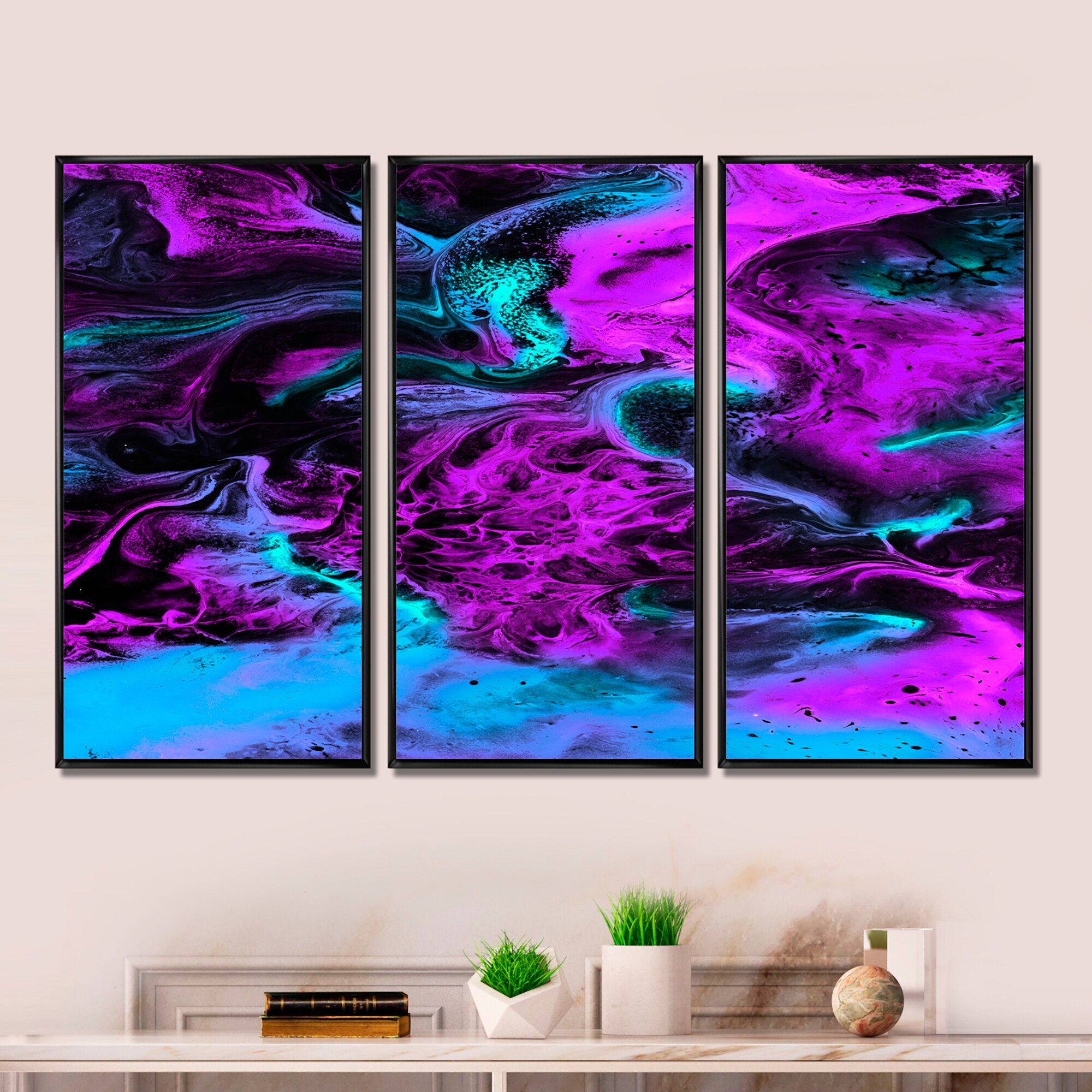 Designart "Neon Liquid Art in Purple And Blue" Modern Framed Wall Art Set of 3 - 4 Colors of Frames