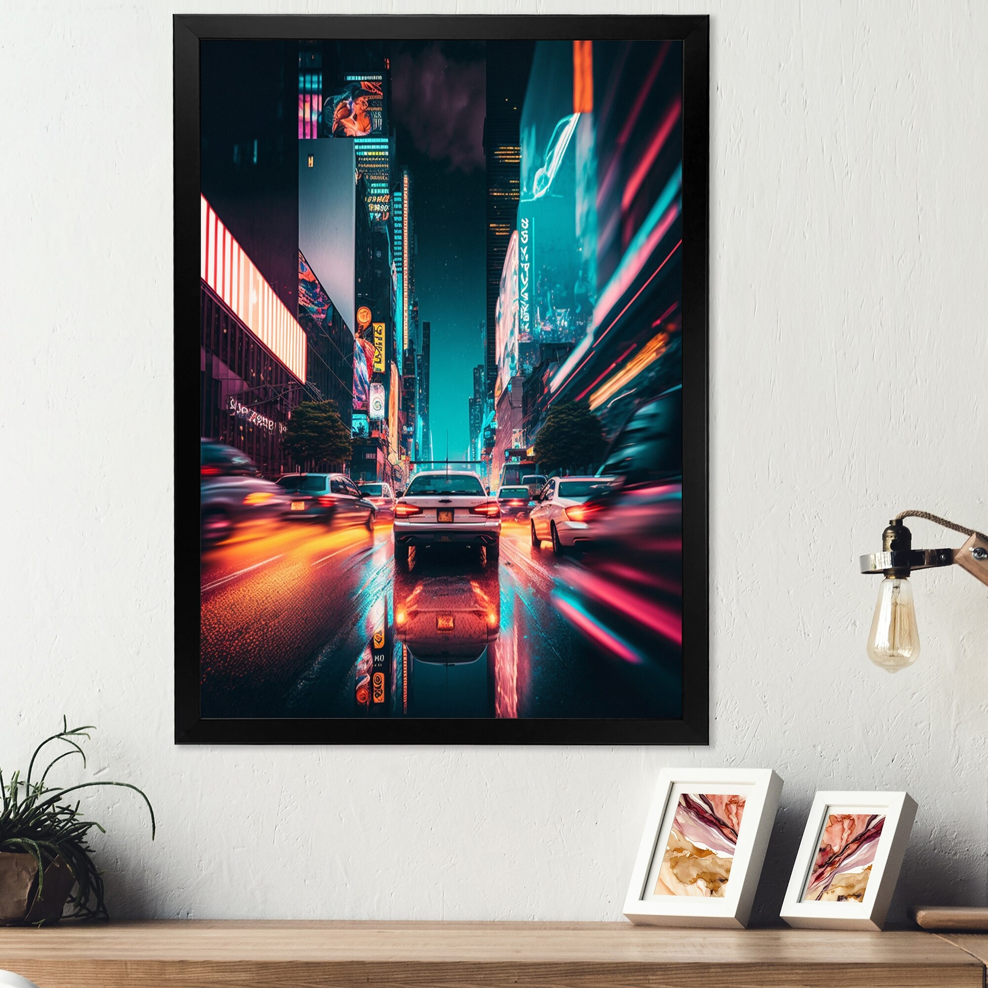 Designart "Futuristic New York City Neon III" Cityscapes Framed Art Print
