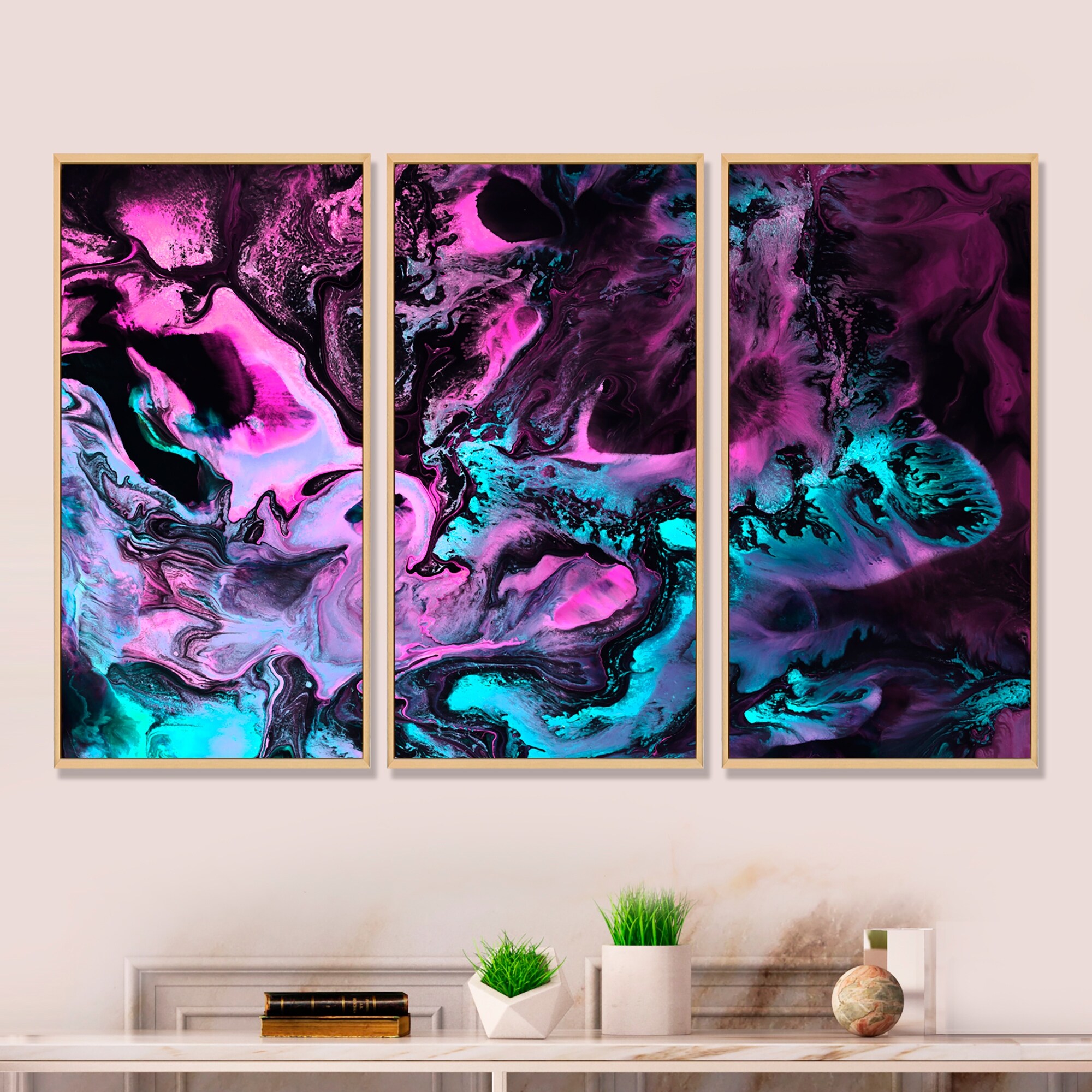 Designart "Neon Pink Blue And Green Liquid Art Landscape" Modern Framed Canvas Wall Art Print Set of 3 - 4 Colors of Frames