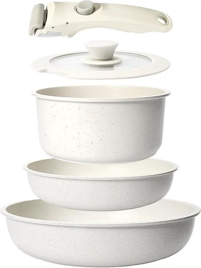 CAROTE 19pcs Pots and Pans Set Non Stick, Cookware Sets, Kitchen Set, Oven/Fridge Safe, Space Saving Pots Set, Nonstick Cooking Set with Versatile Detachable Handle, Induction RV Set, Cream White