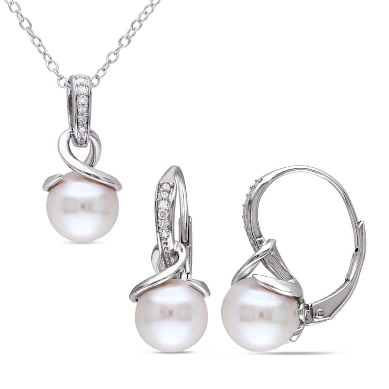 Miadora Sterling Silver 1/10ct TDW Diamond and Cultured Freshwater Pearl Earrings and Necklace Set (8-8.5 mm) - White