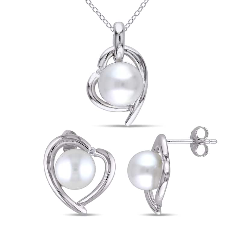 Miadora Sterling Silver Cultured Pearl Diamond Accent Heart Halo Stud Earrings and Necklace Set (8-9mm) (G-H, I2-I3) - White