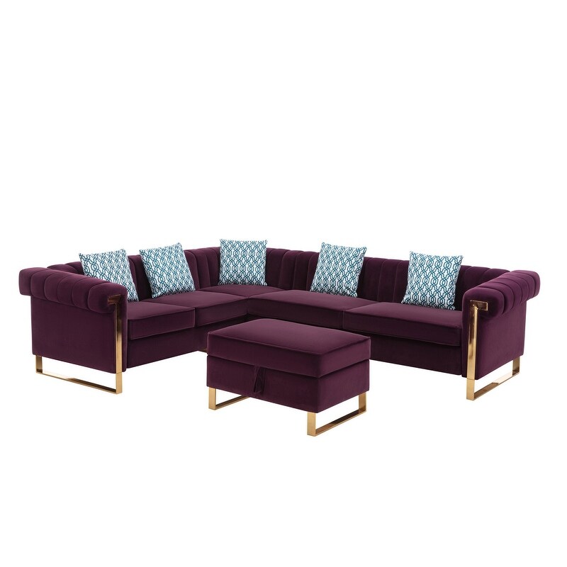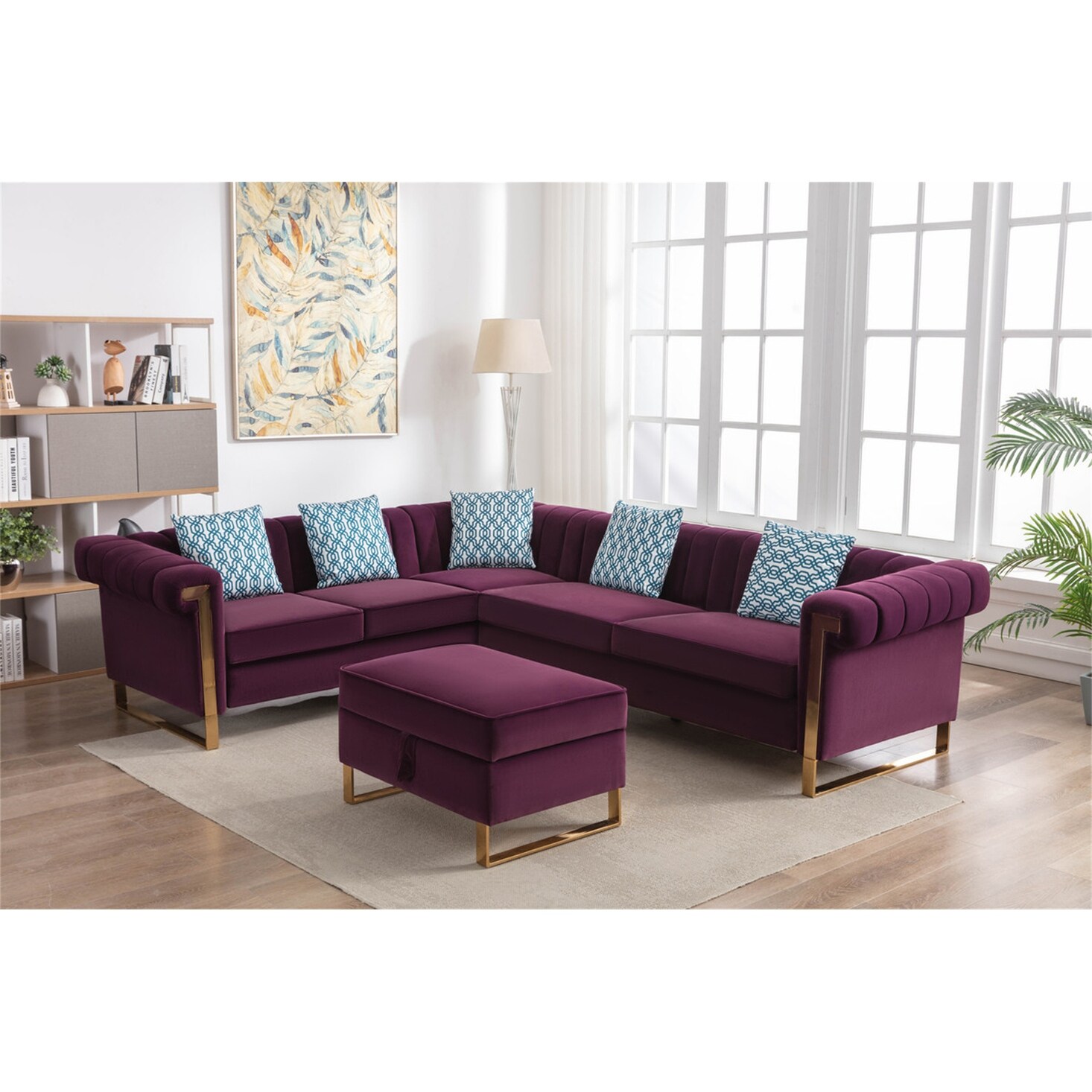Purple Velvet Sectional Sofa with Storage Ottoman