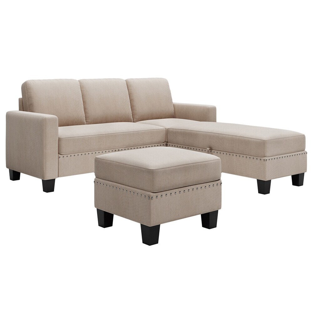 Nailheaded Textured Fabric 3 pieces Sofa Set, L Sectional Sofa with Ottoman,Reversible Storage Chaise