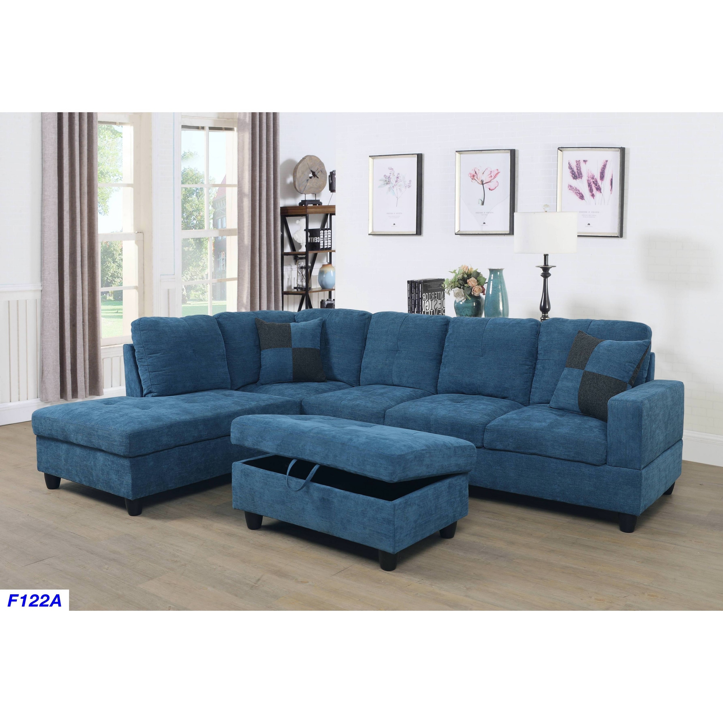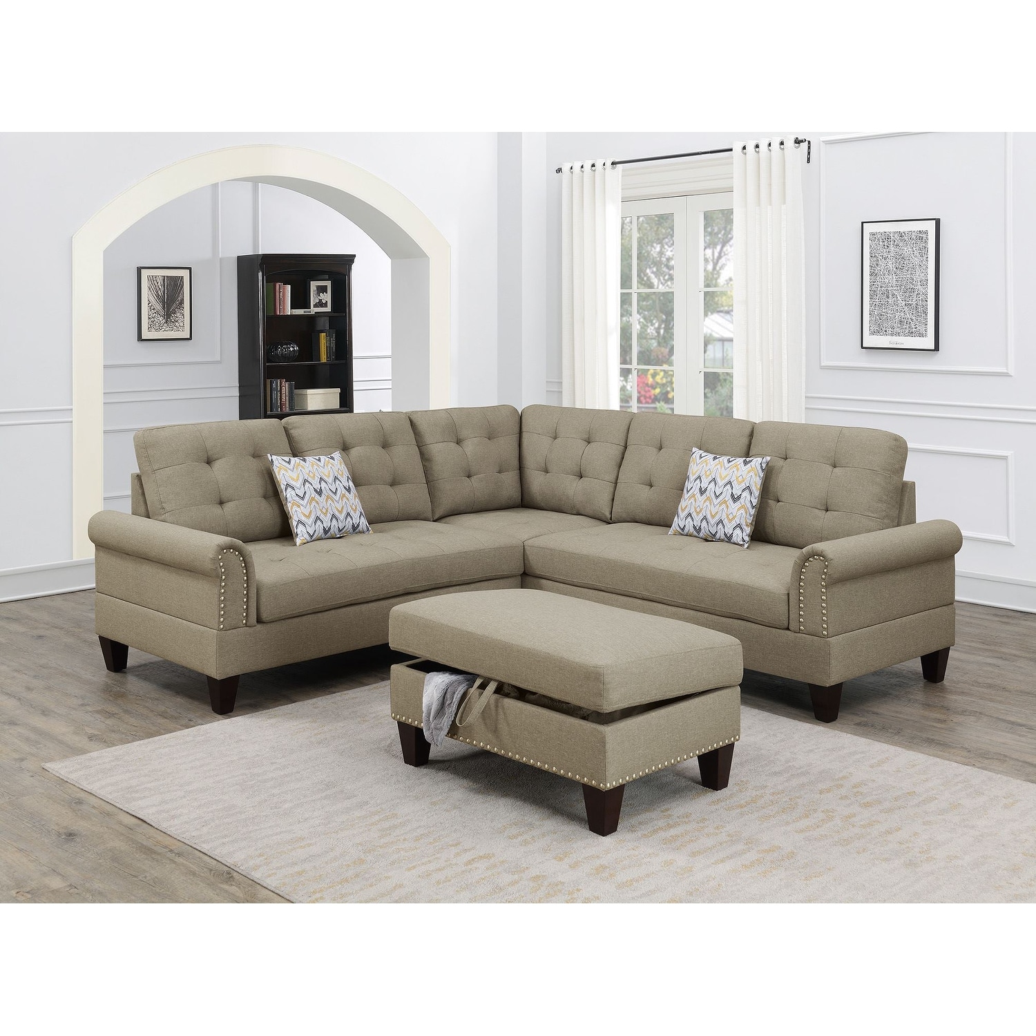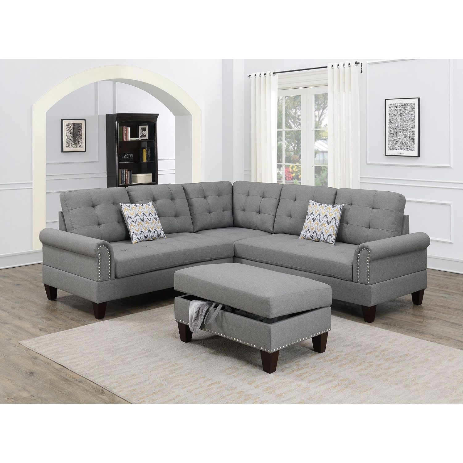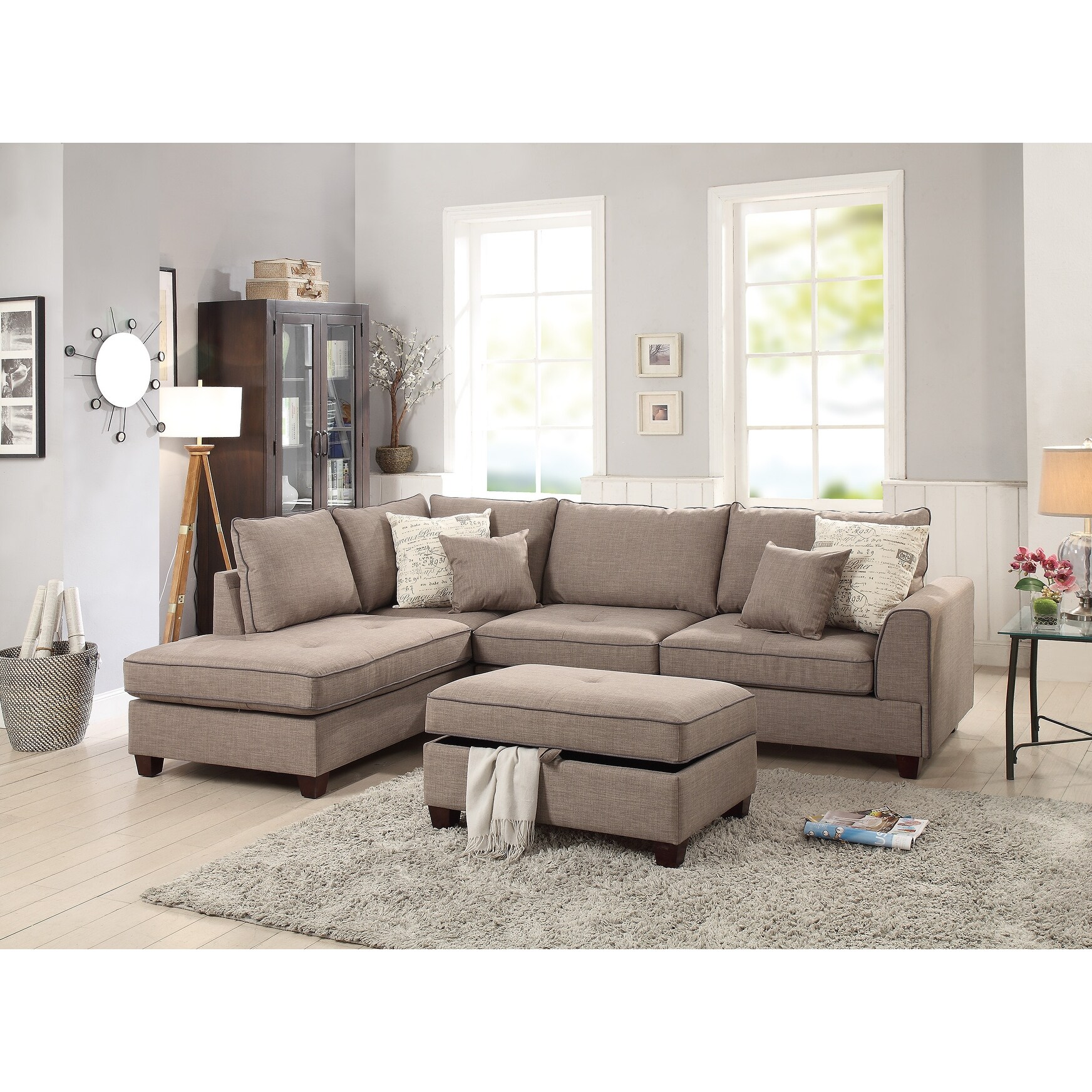 Poundex 3 Piece Fabric Sectional Sofa Set with Storage Ottoman