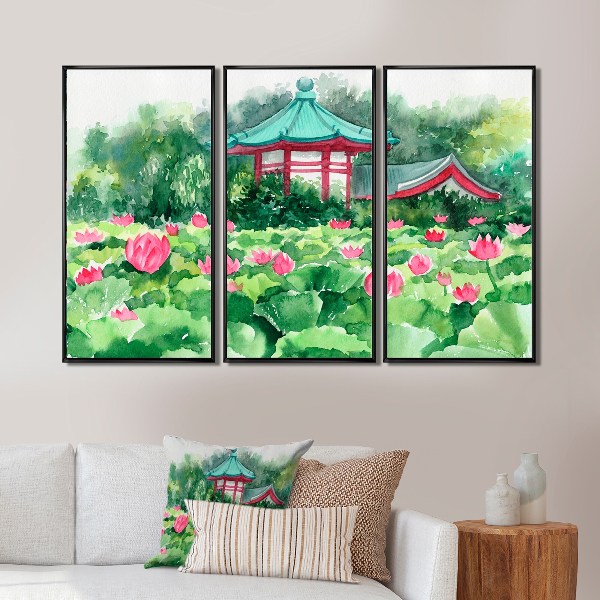 Designart "Lotus Lake and Pagoda" Traditional Framed Art Set of 3 - 4 Colors of Frames