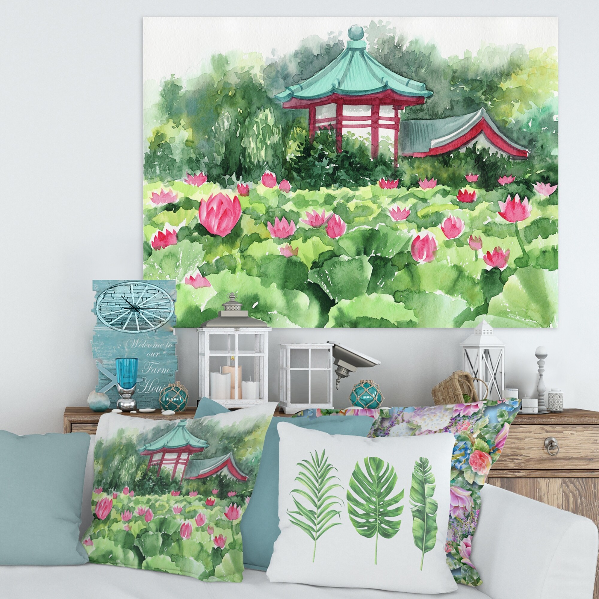 Designart "Lotus Lake and Pagoda" Traditional Canvas Wall Art Print