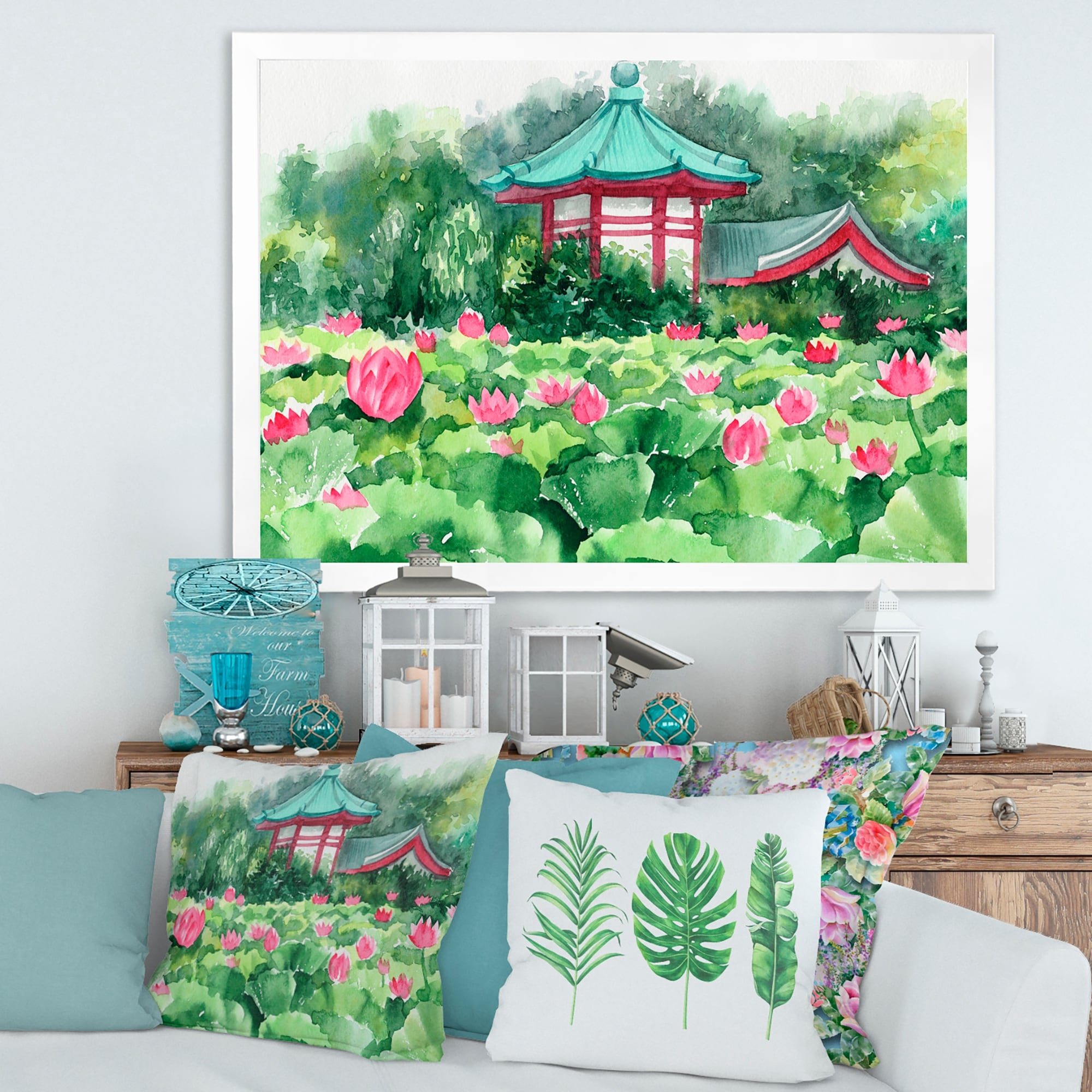 Designart "Lotus Lake and Pagoda" Traditional Framed Art Print