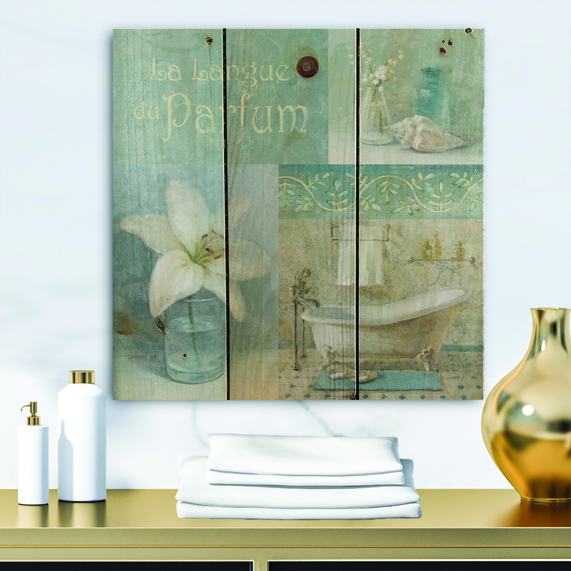 Designart 'Bathroom Lily Parfum Bath Story' Traditional Print on Natural Pine Wood - Blue