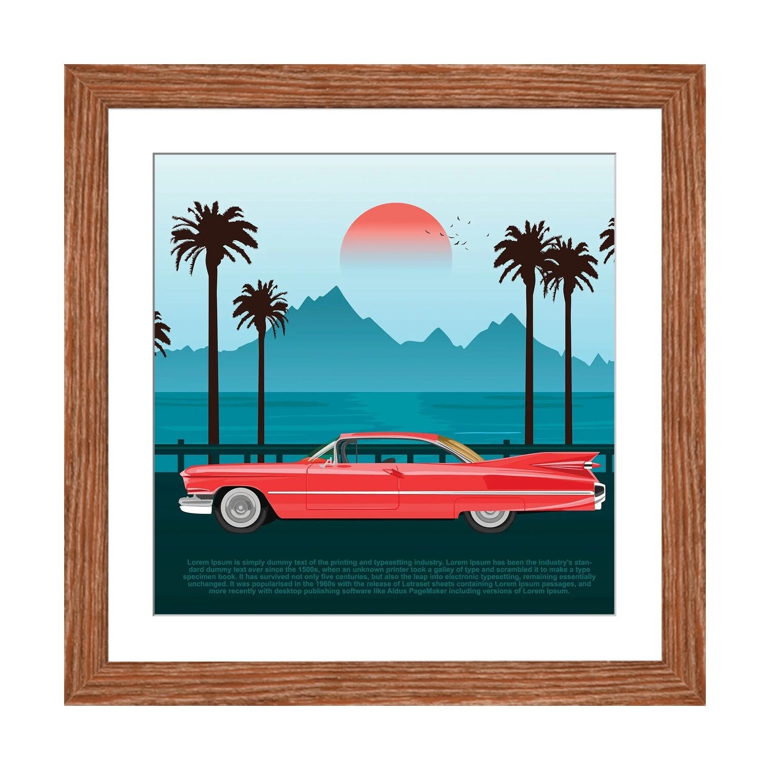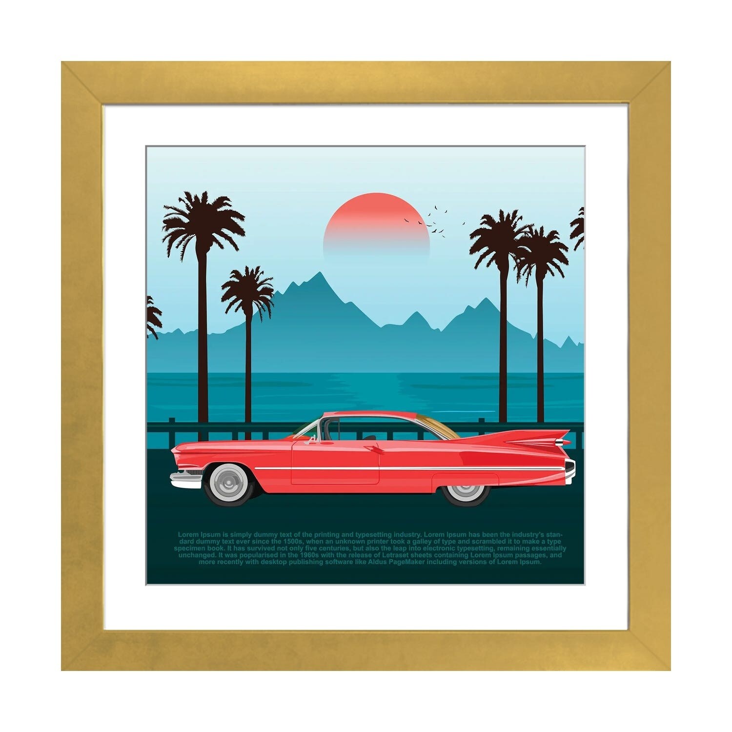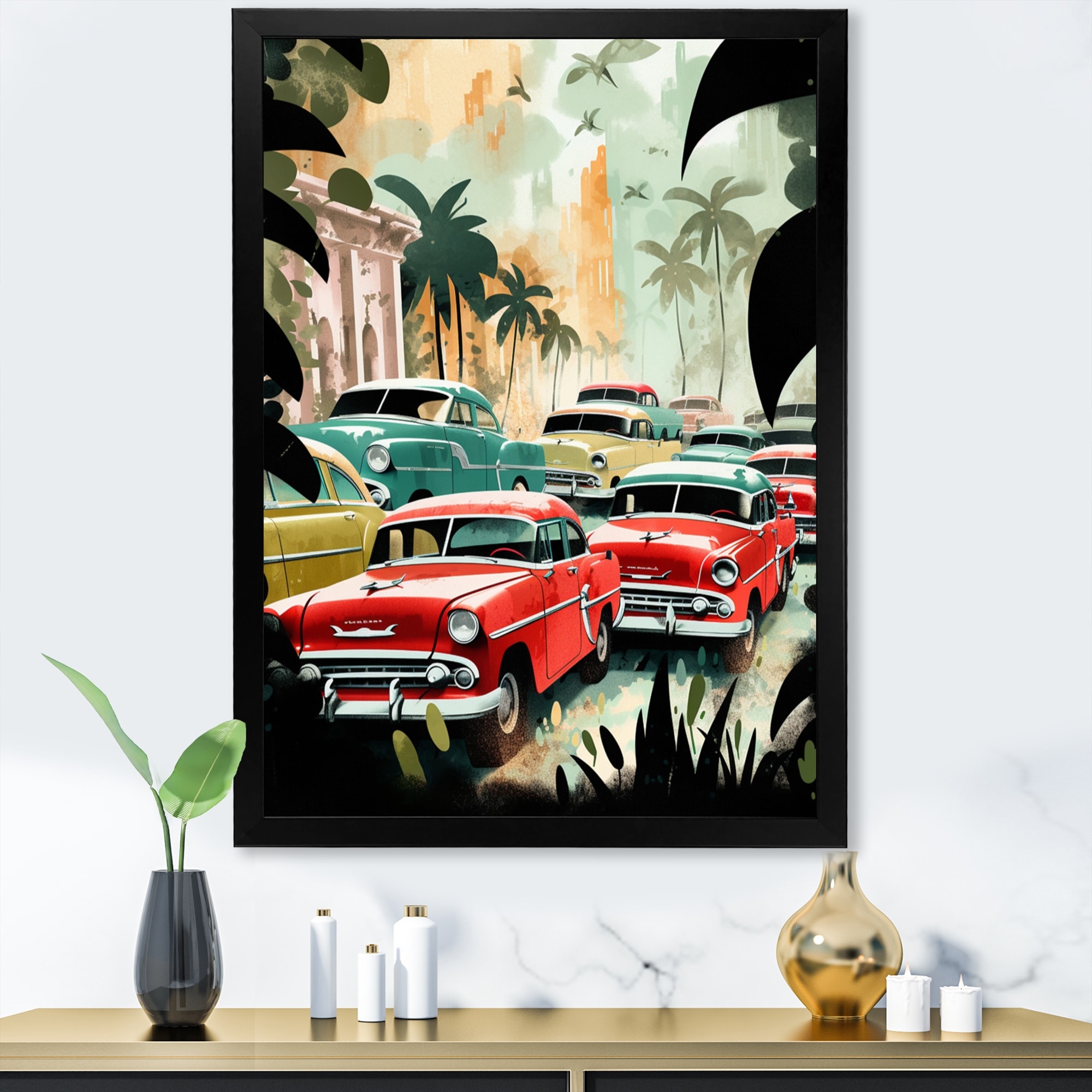Designart "Red And Green Retro Cars in Tropical Paradise" Retro Car Framed Wall Decor