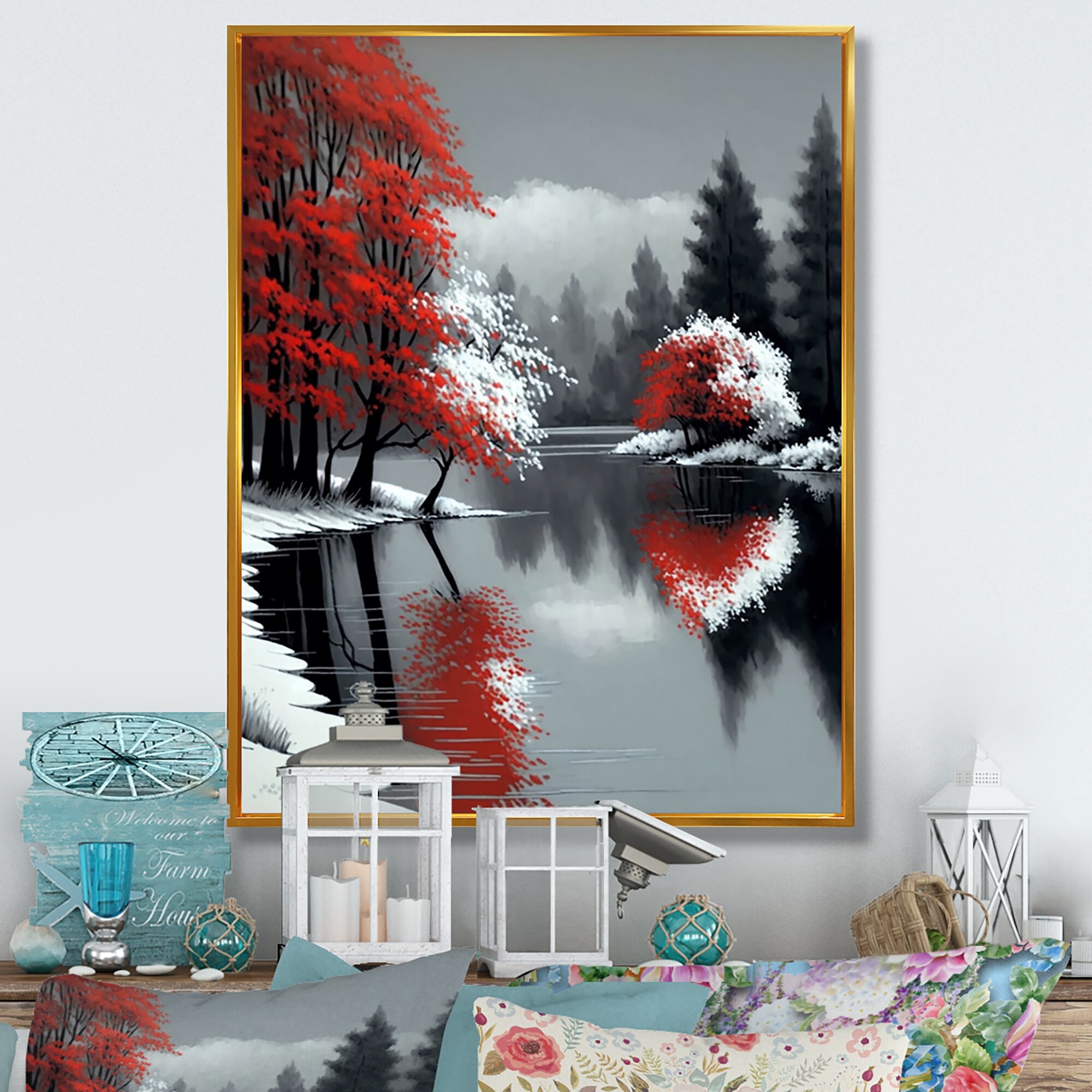 Designart "Snowy Red Trees By the Riverside" Landscape Forest Framed Canvas Wall Art Print