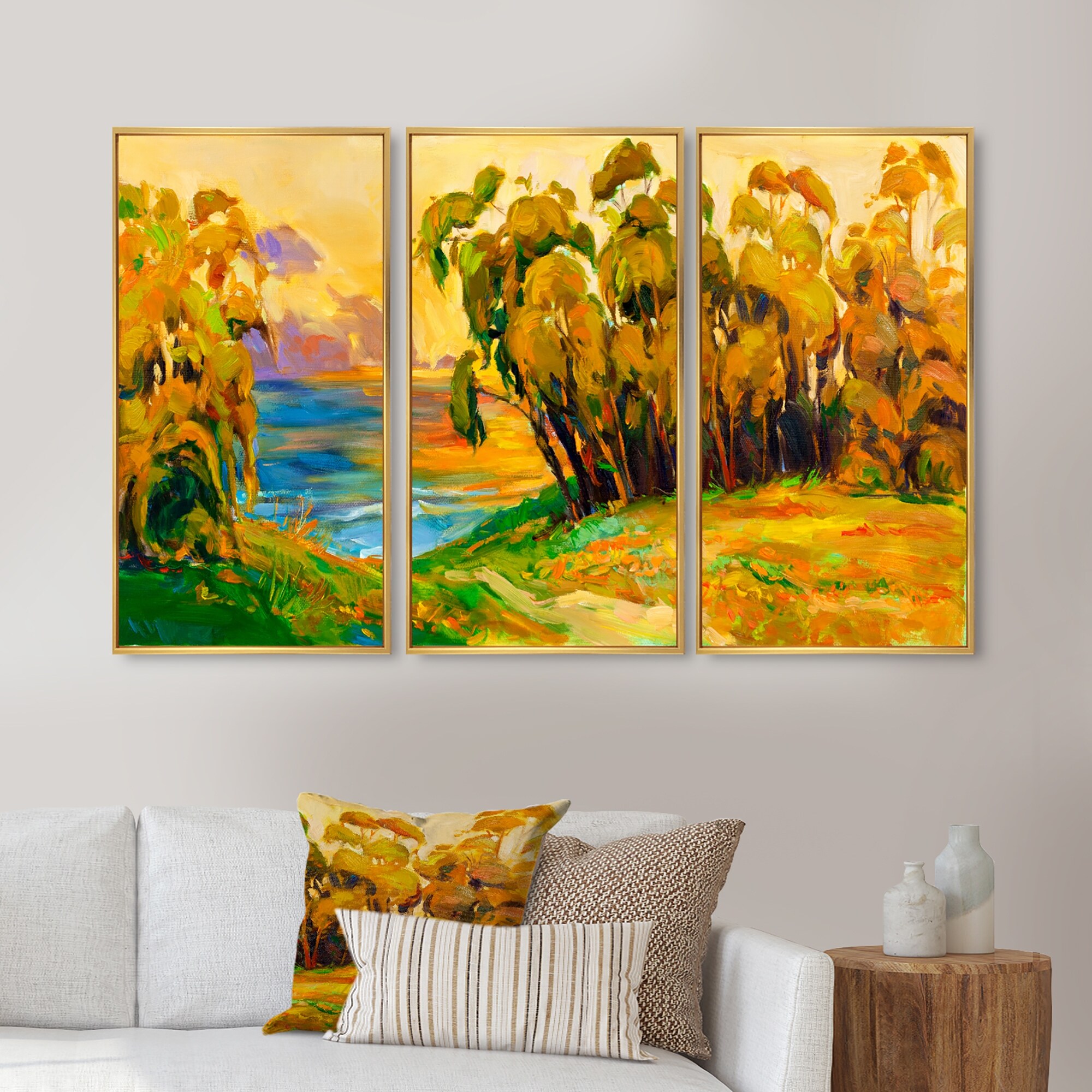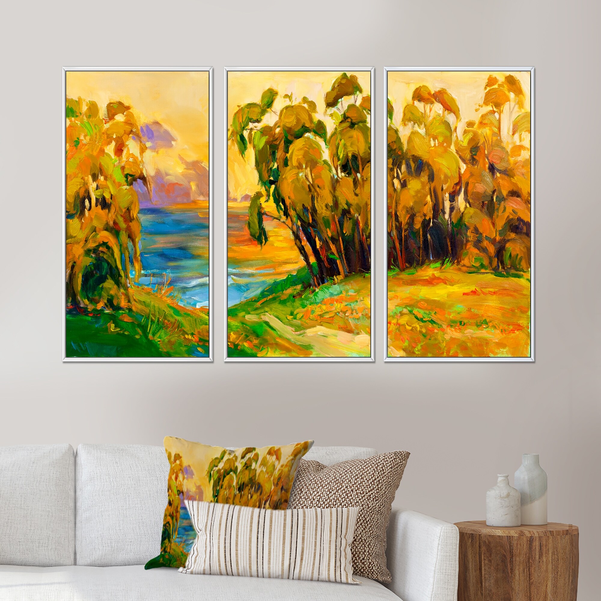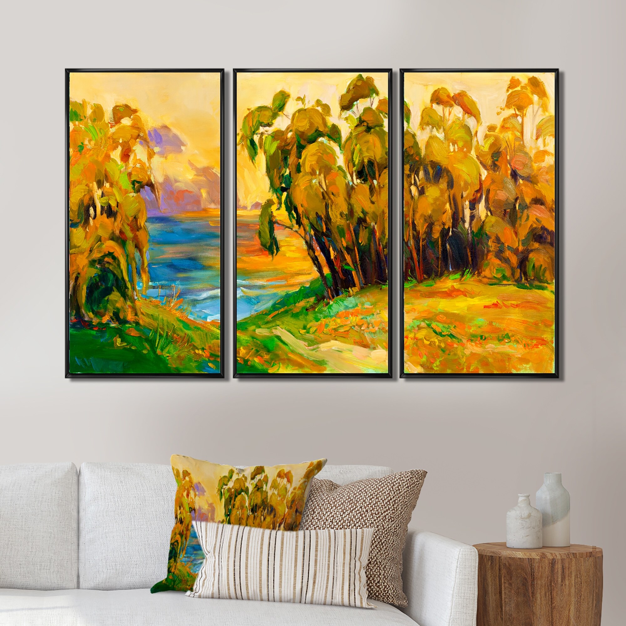 Designart "Yellow Birches By the Riverside I" Landscape Forest Framed Canvas Wall Art Print - 3 Panels