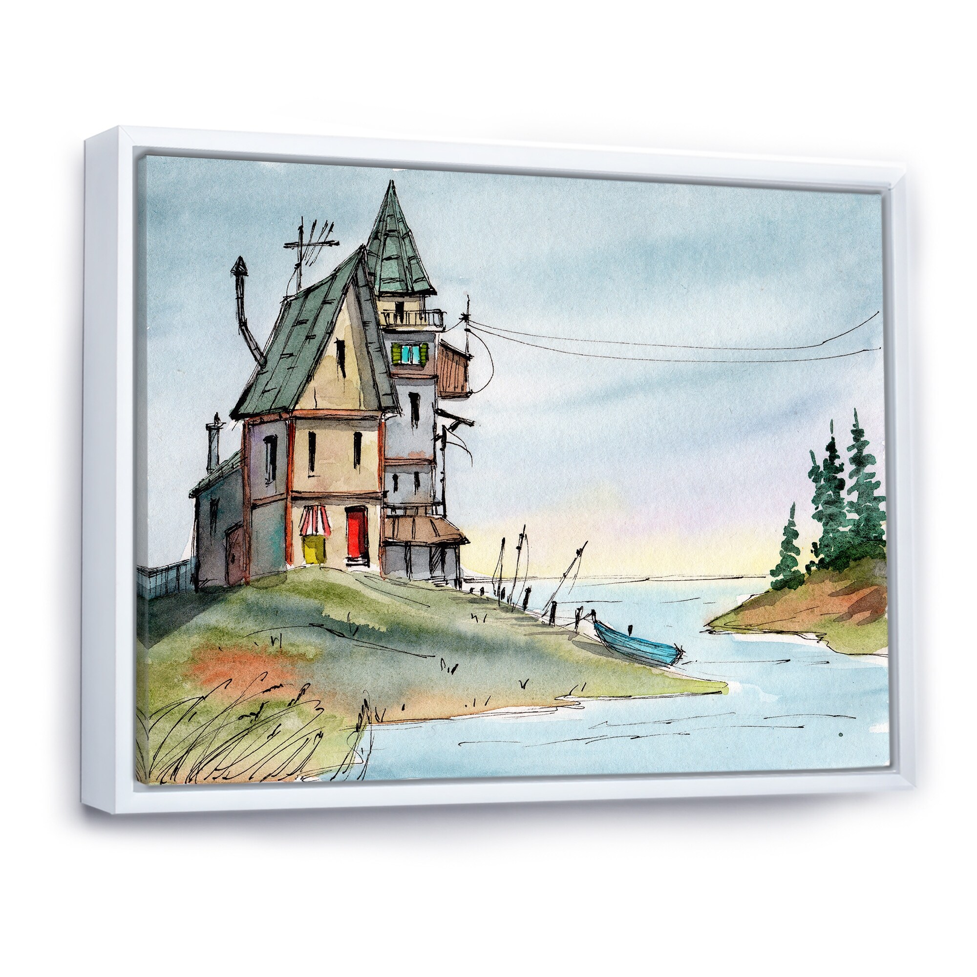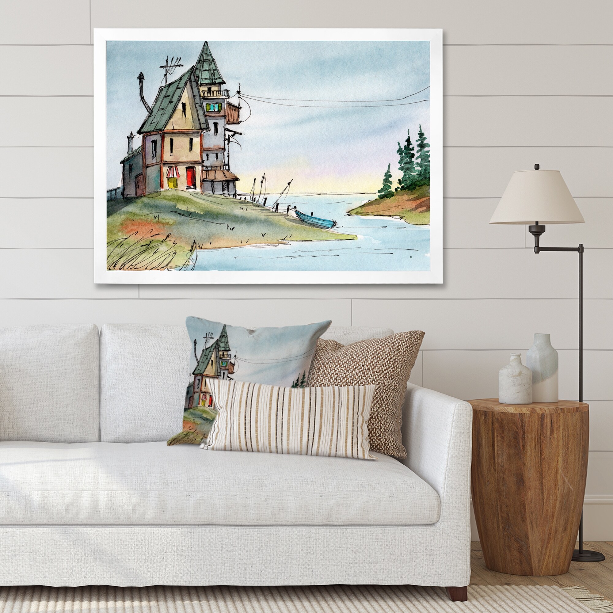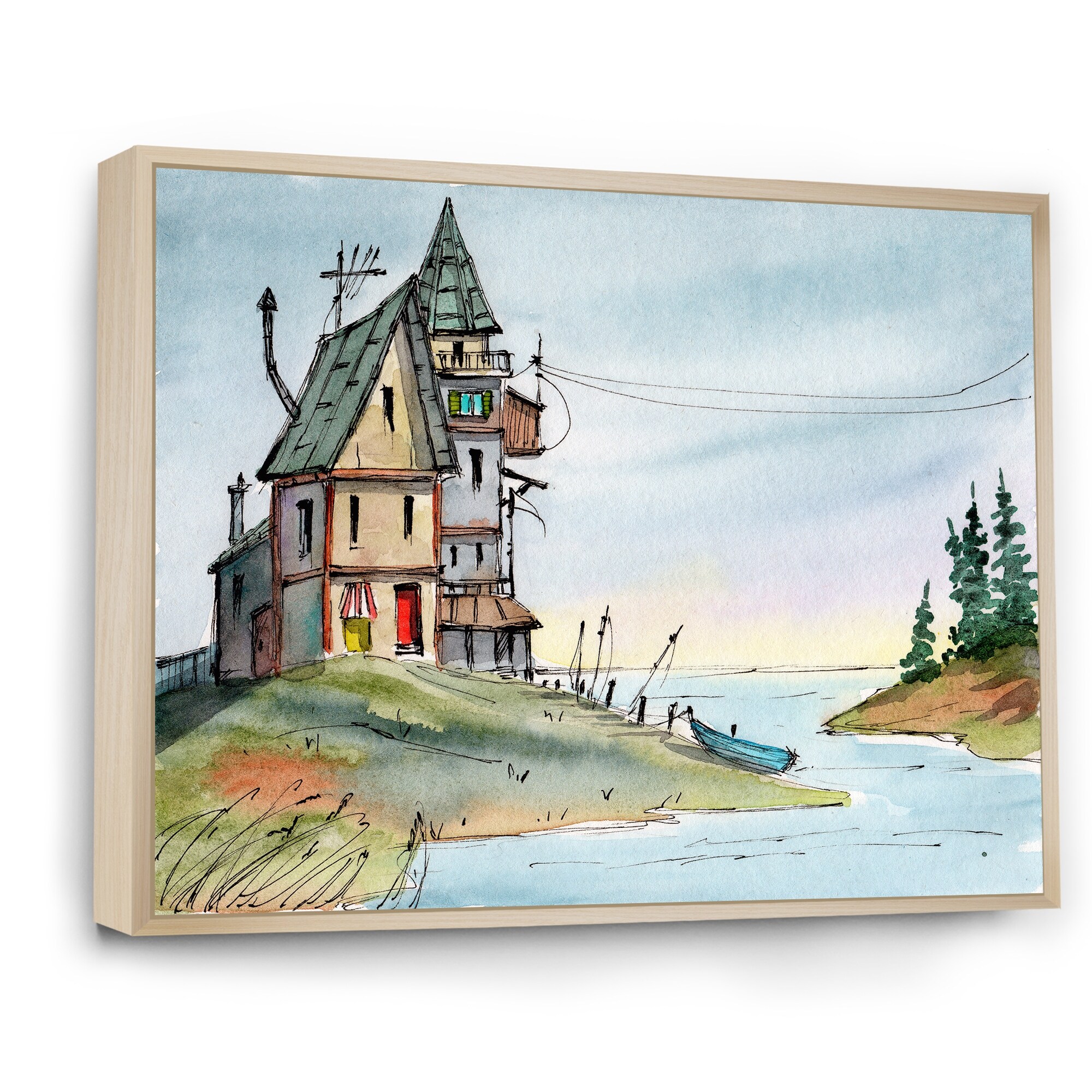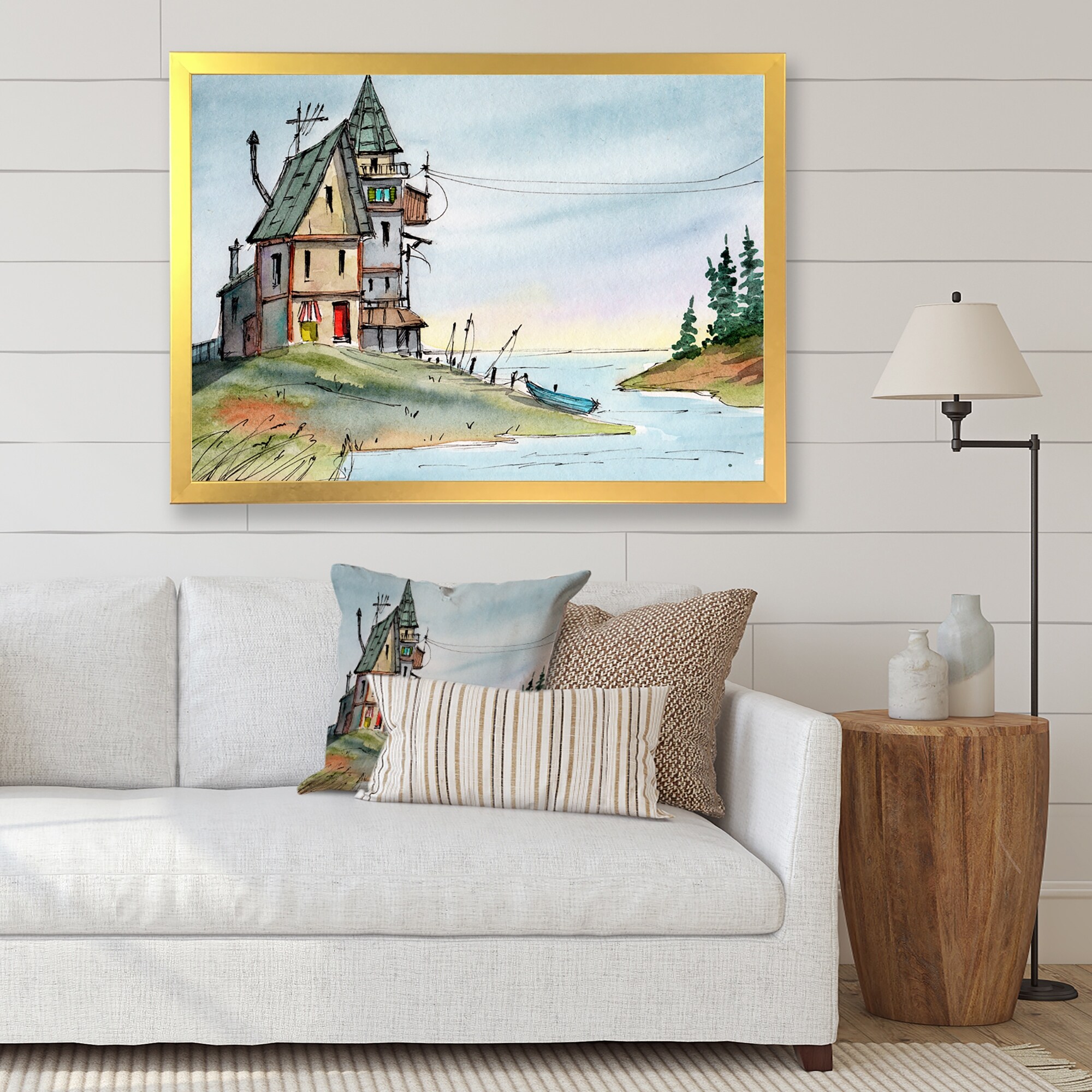 Designart "Colorful Old House With A Tower By the Riverside" Nautical & Coastal Framed Art Print