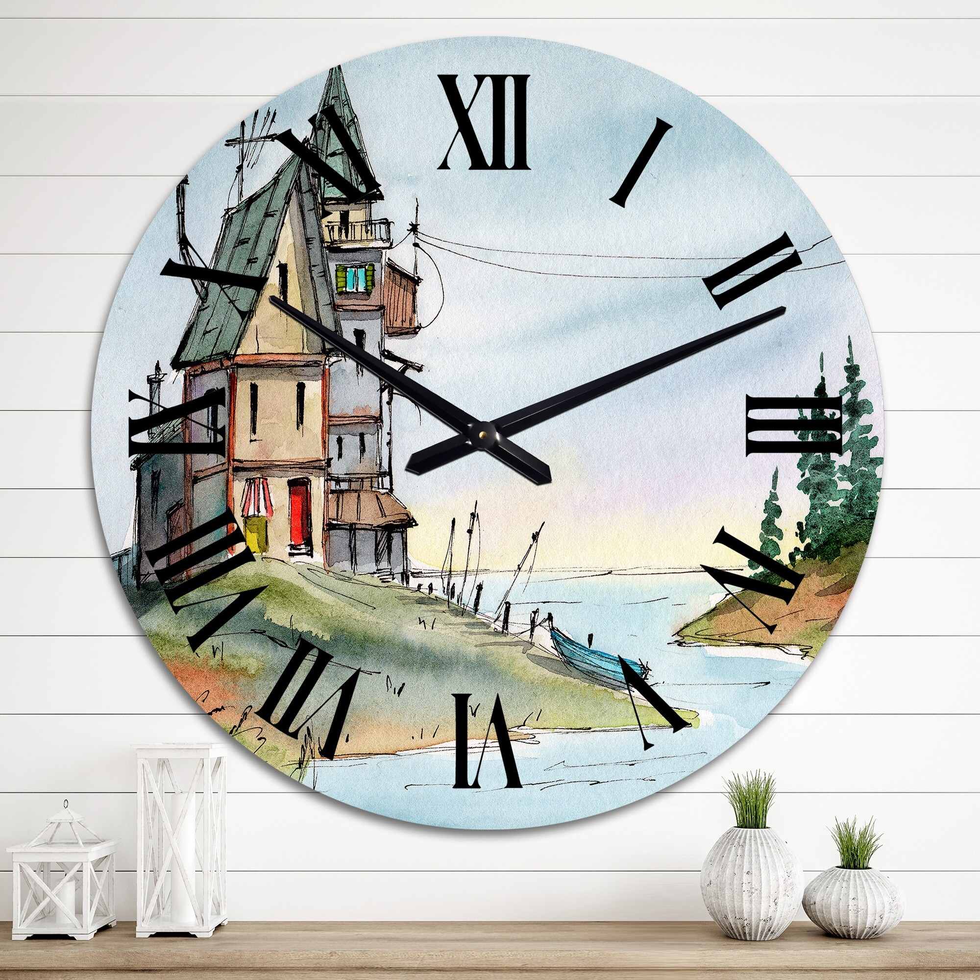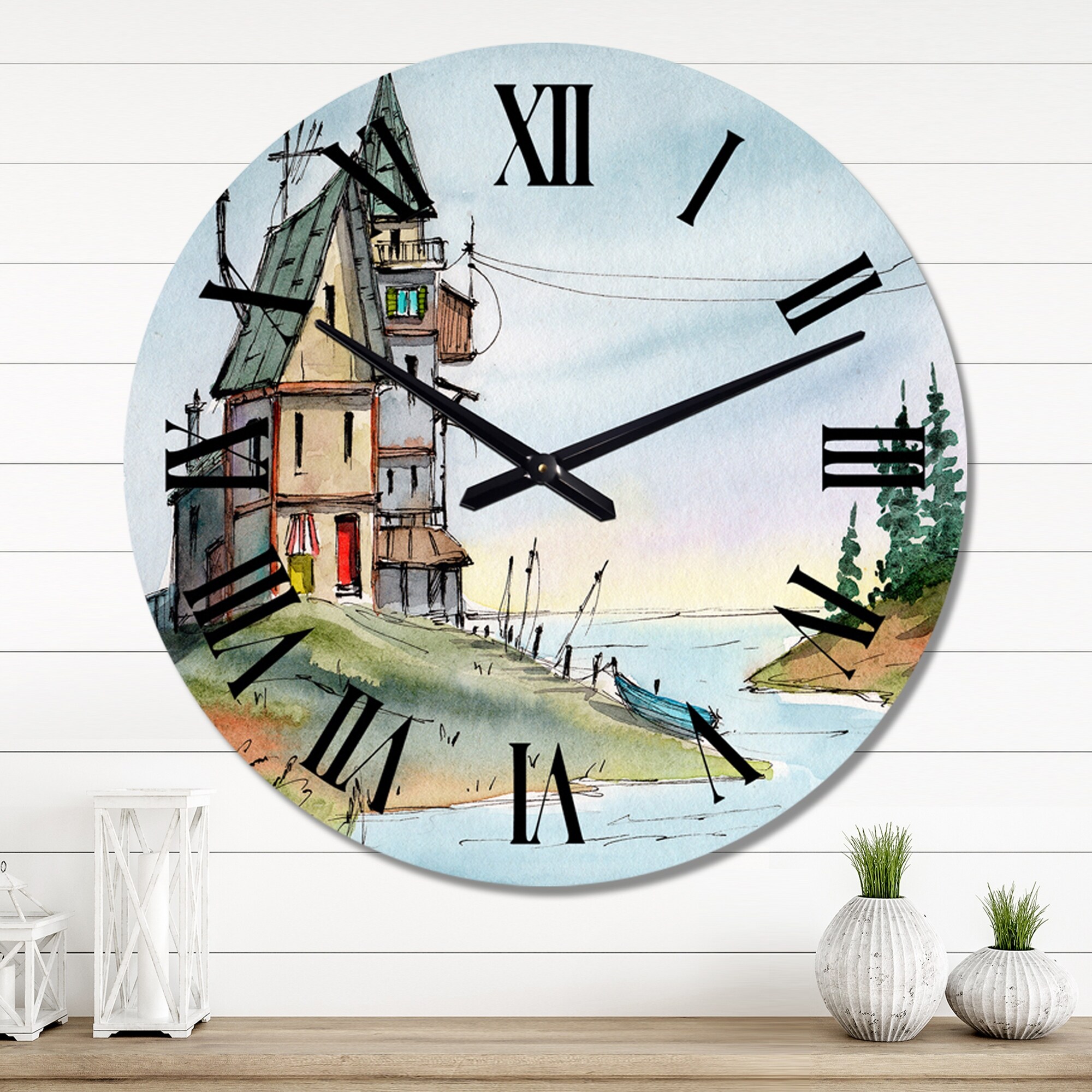 Designart 'Colorful Old House With A Tower By the Riverside' Nautical & Coastal wall clock