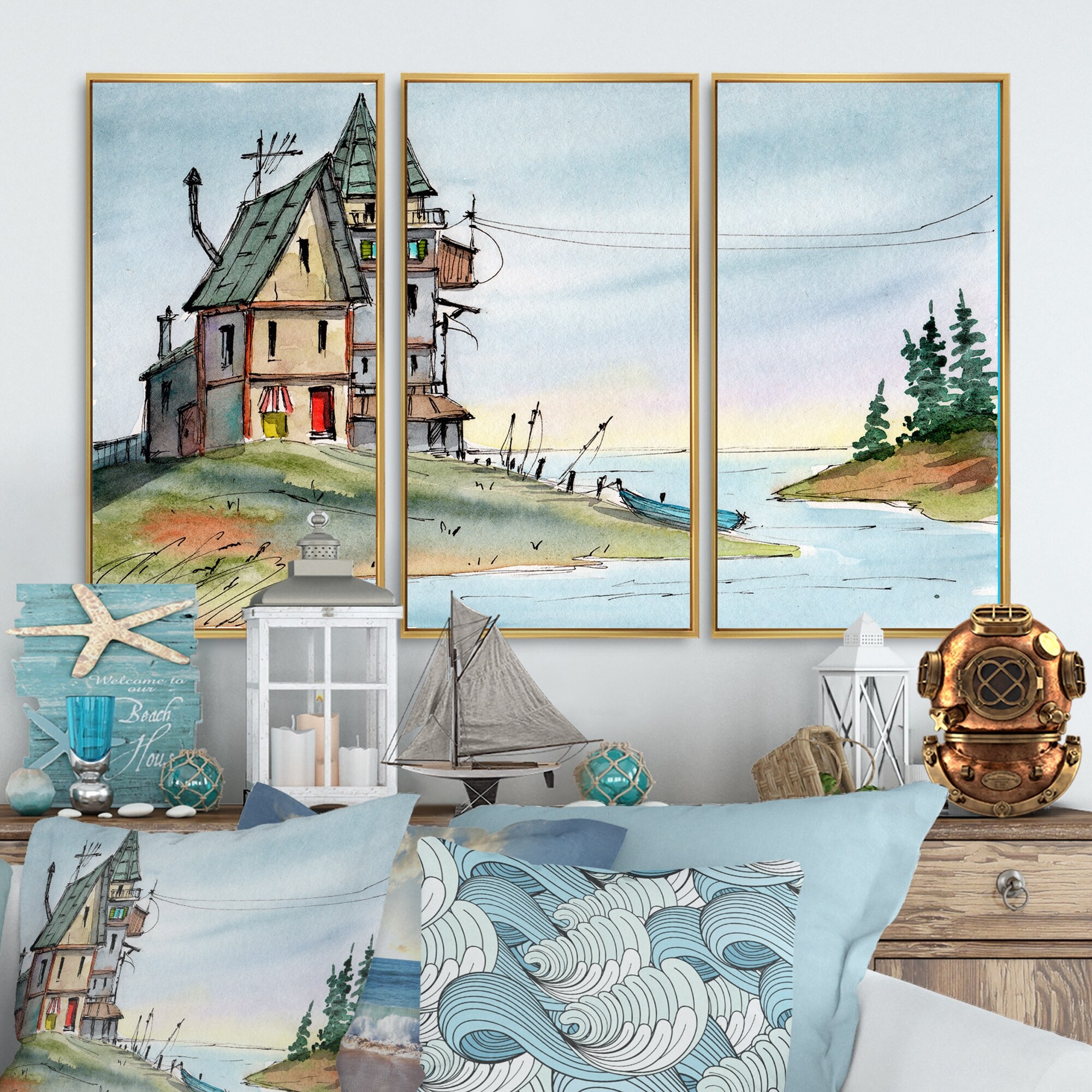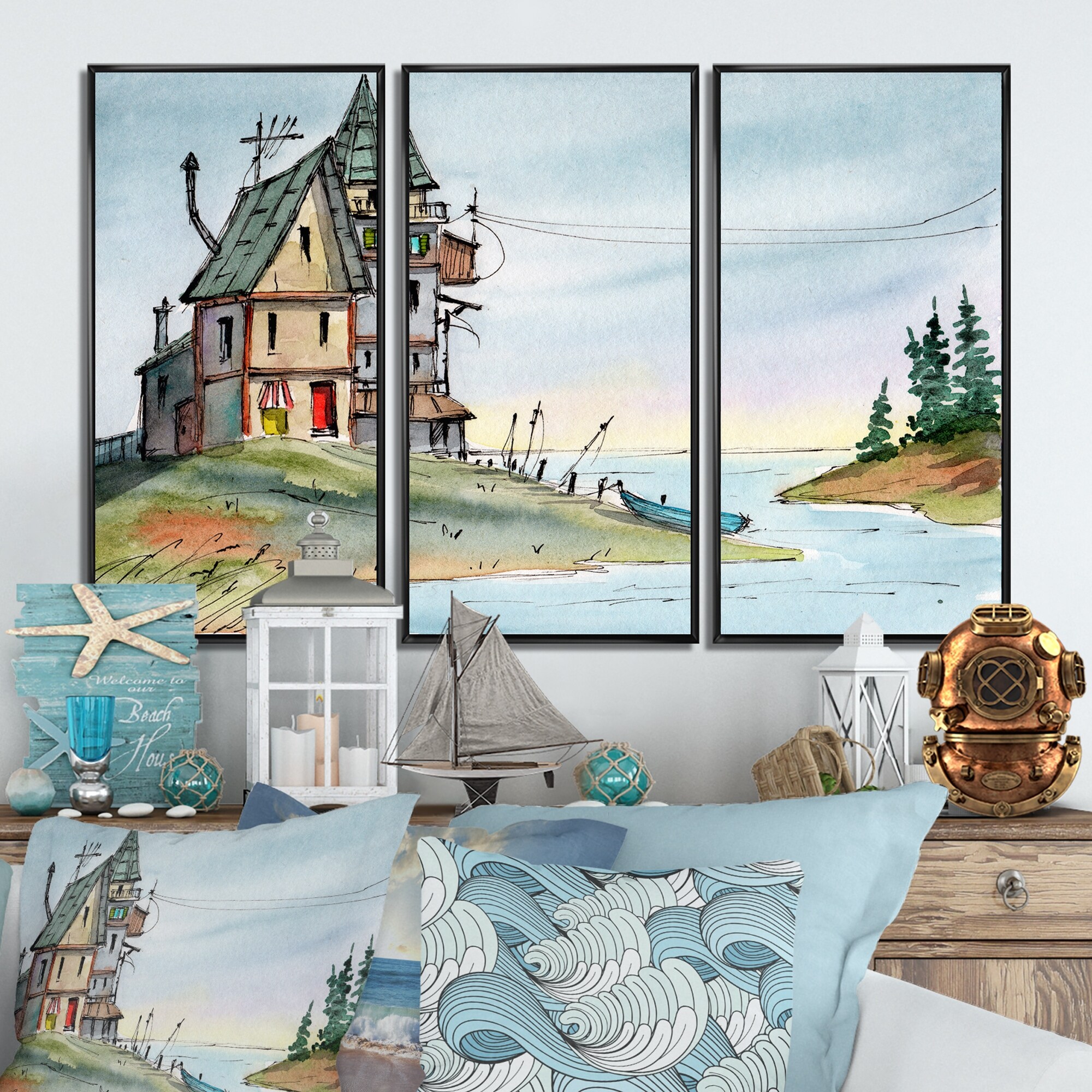 Designart "Colorful Old House With A Tower By the Riverside" Nautical & Coastal Framed Canvas Wall Art Print - 3 Panels