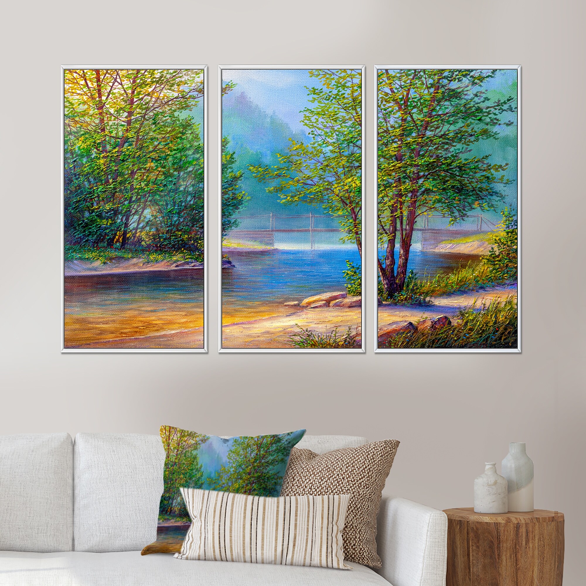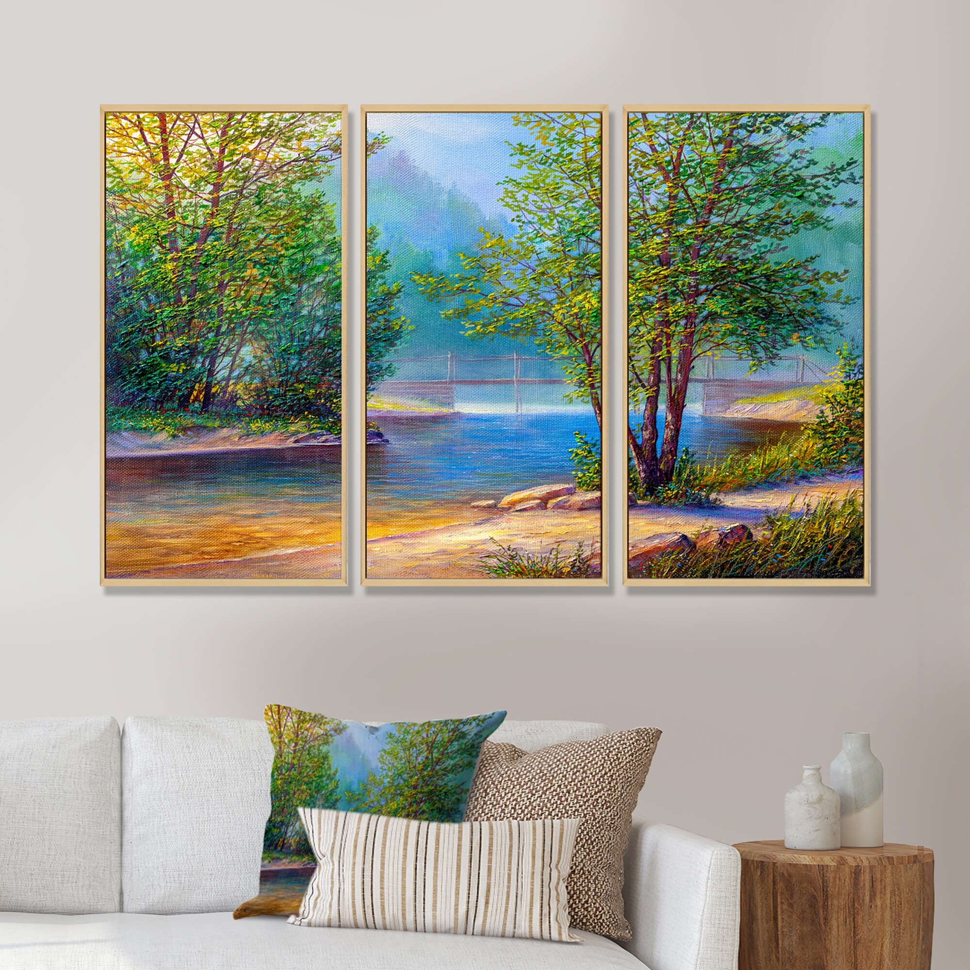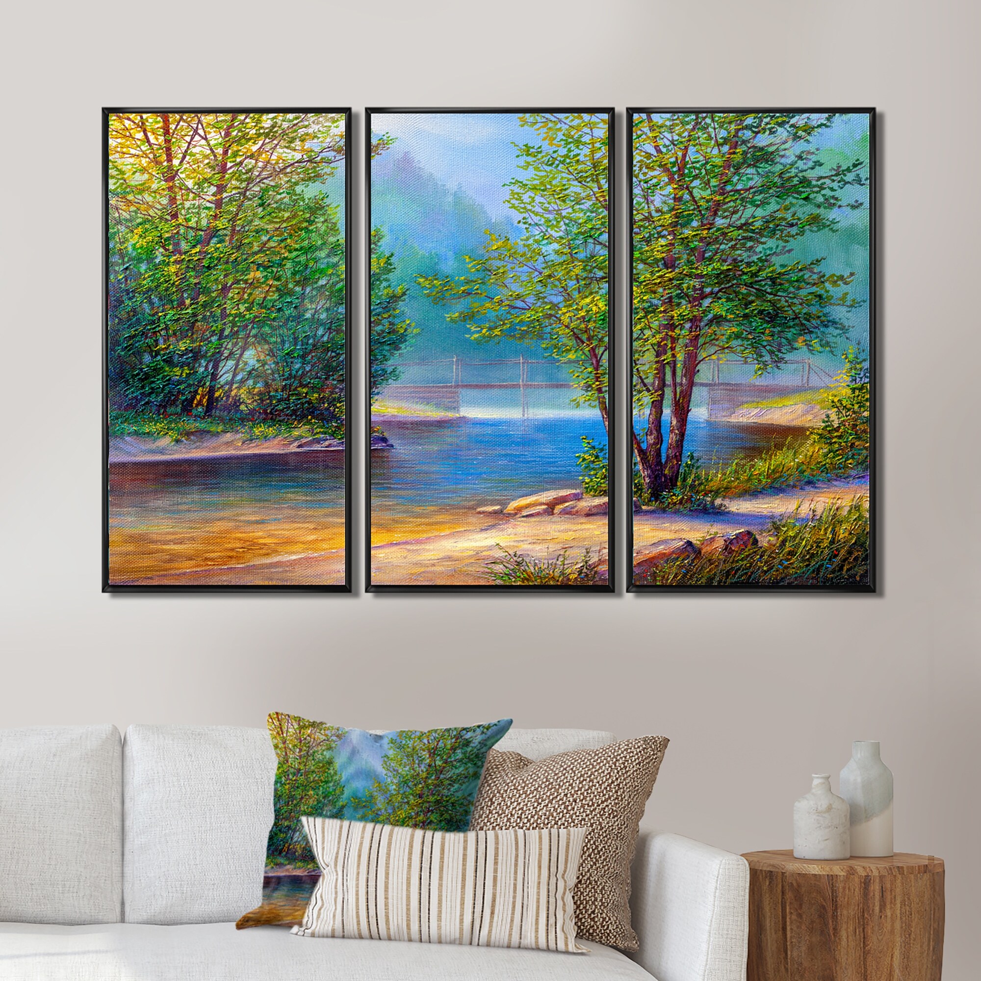 Designart "Green Trees By the Riverside" Traditional Framed Artwork Set of 3 - 4 Colors of Frames