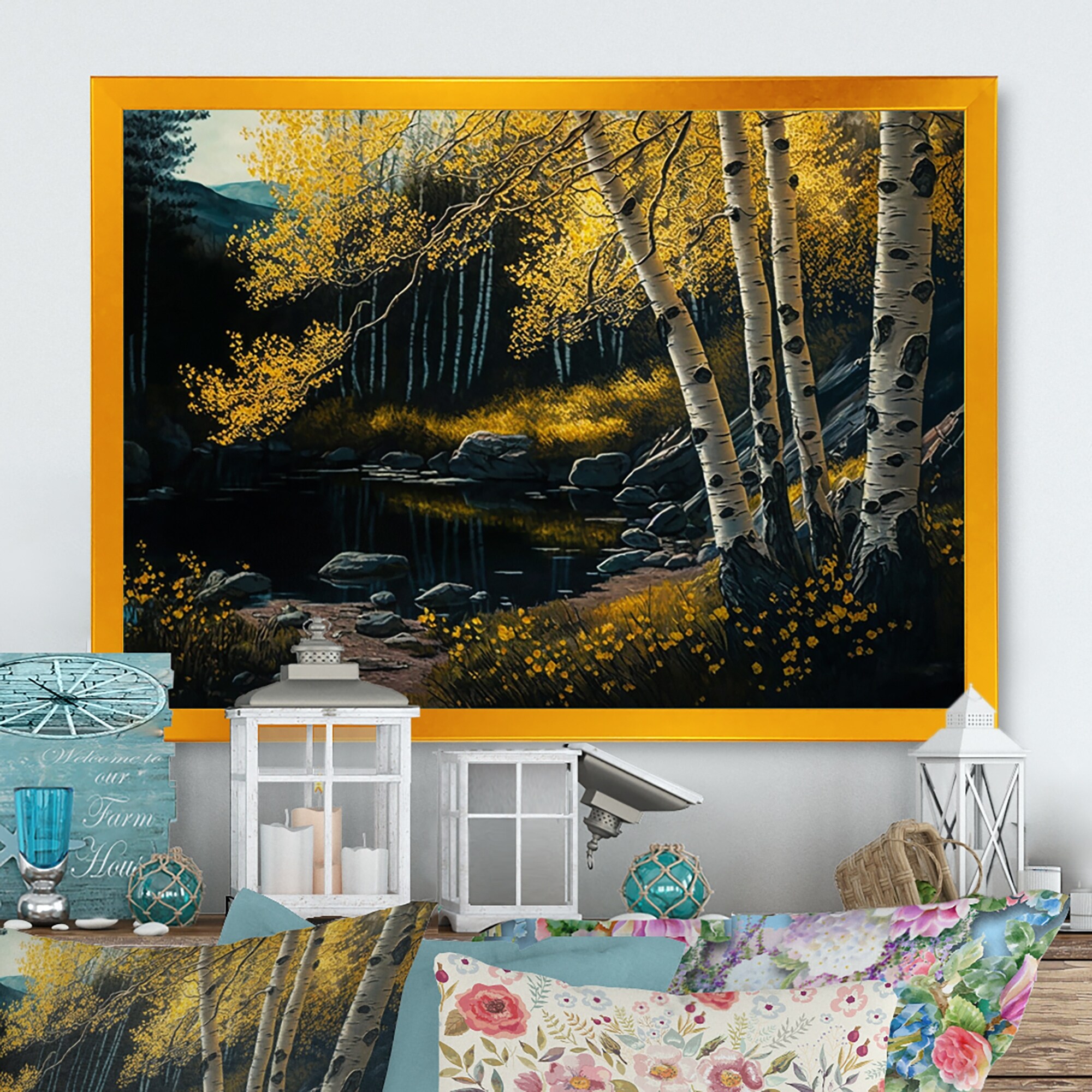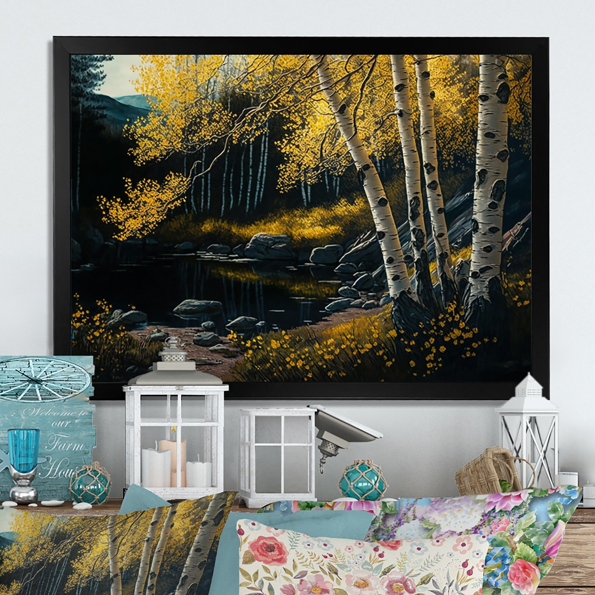 Designart "Yellow Birches By the Riverside I" Landscape Forest Framed Art Print