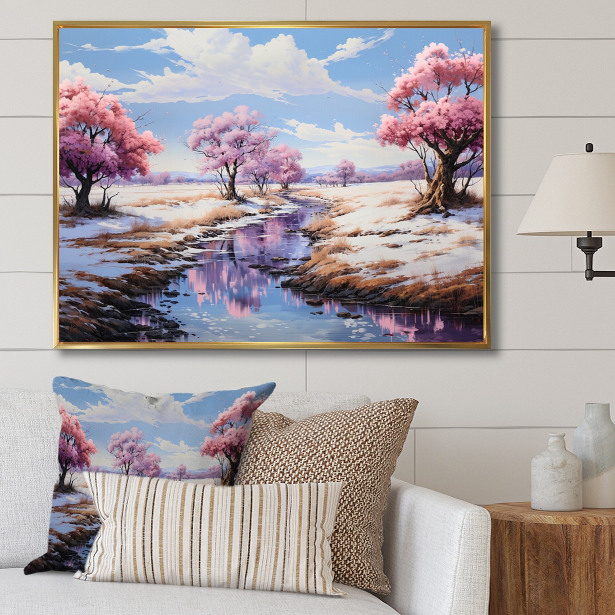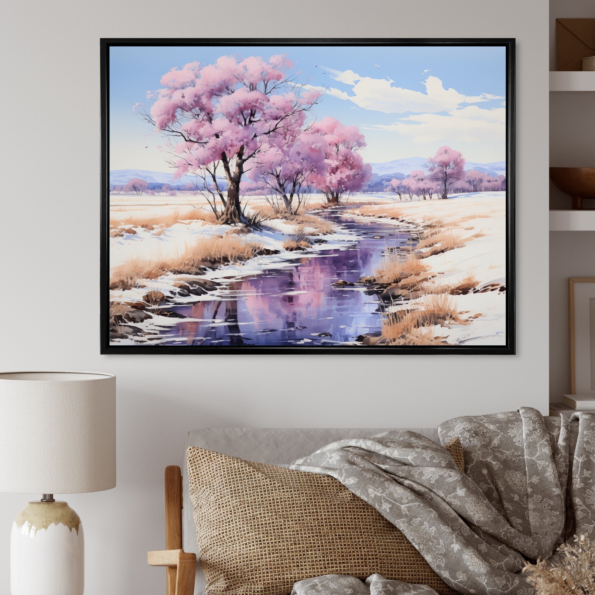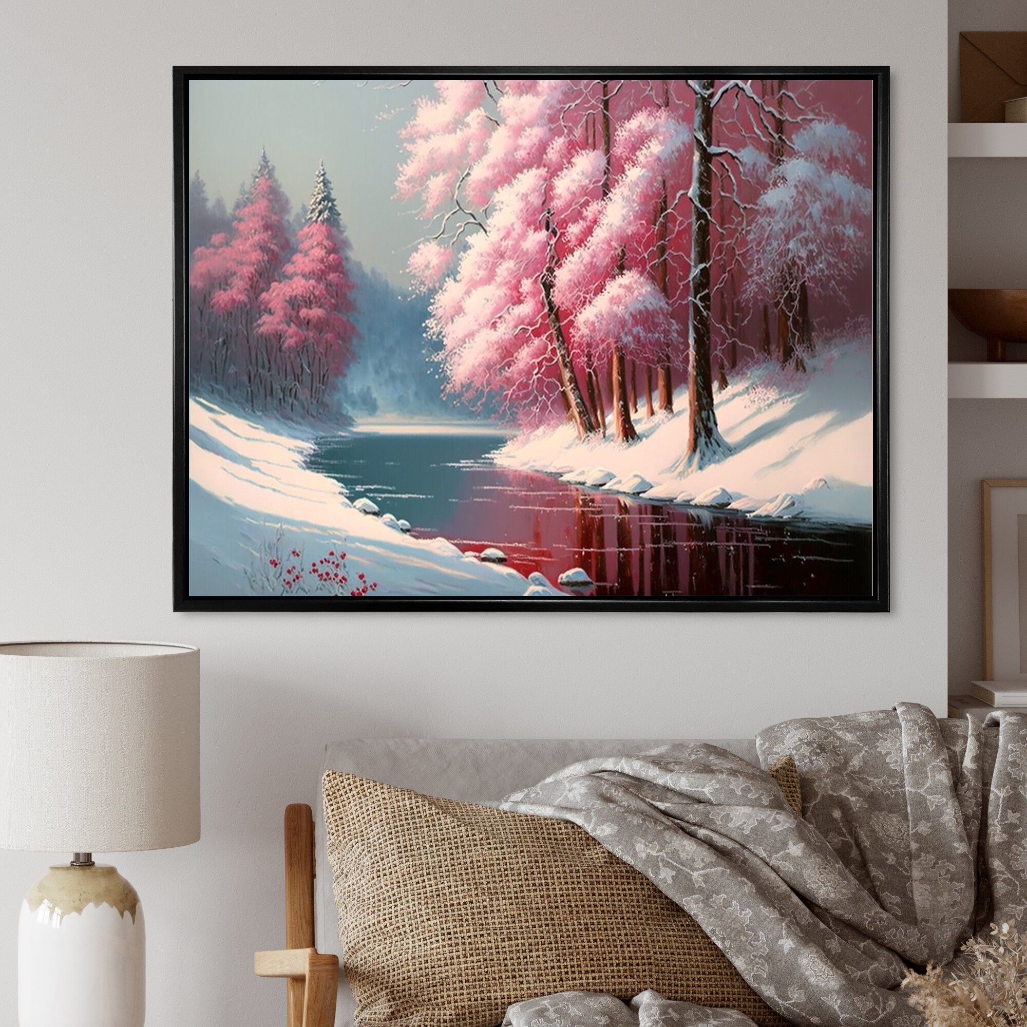 Designart "Pink Winter Trees By the Riverside" Landscape Lake River Framed Canvas Wall Art