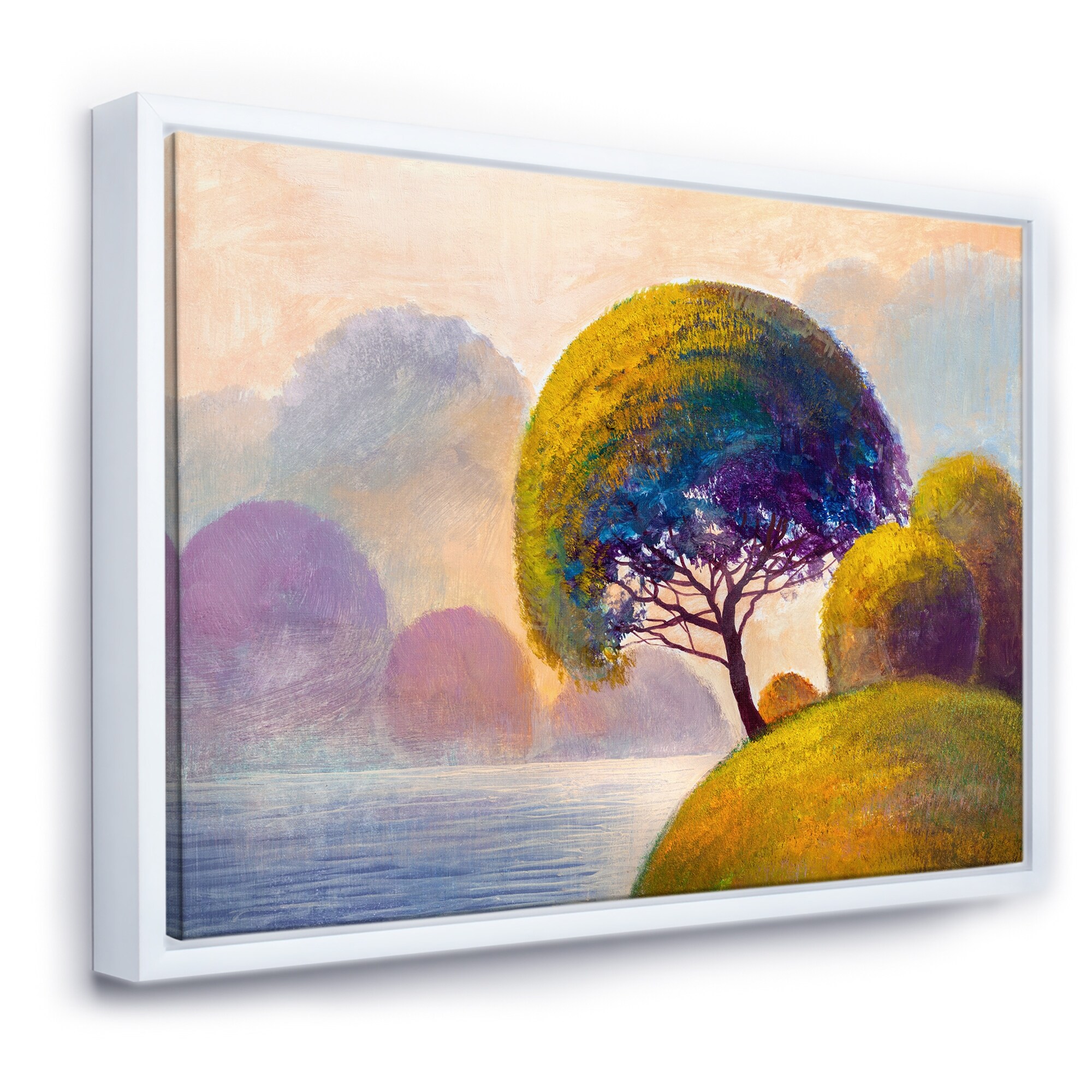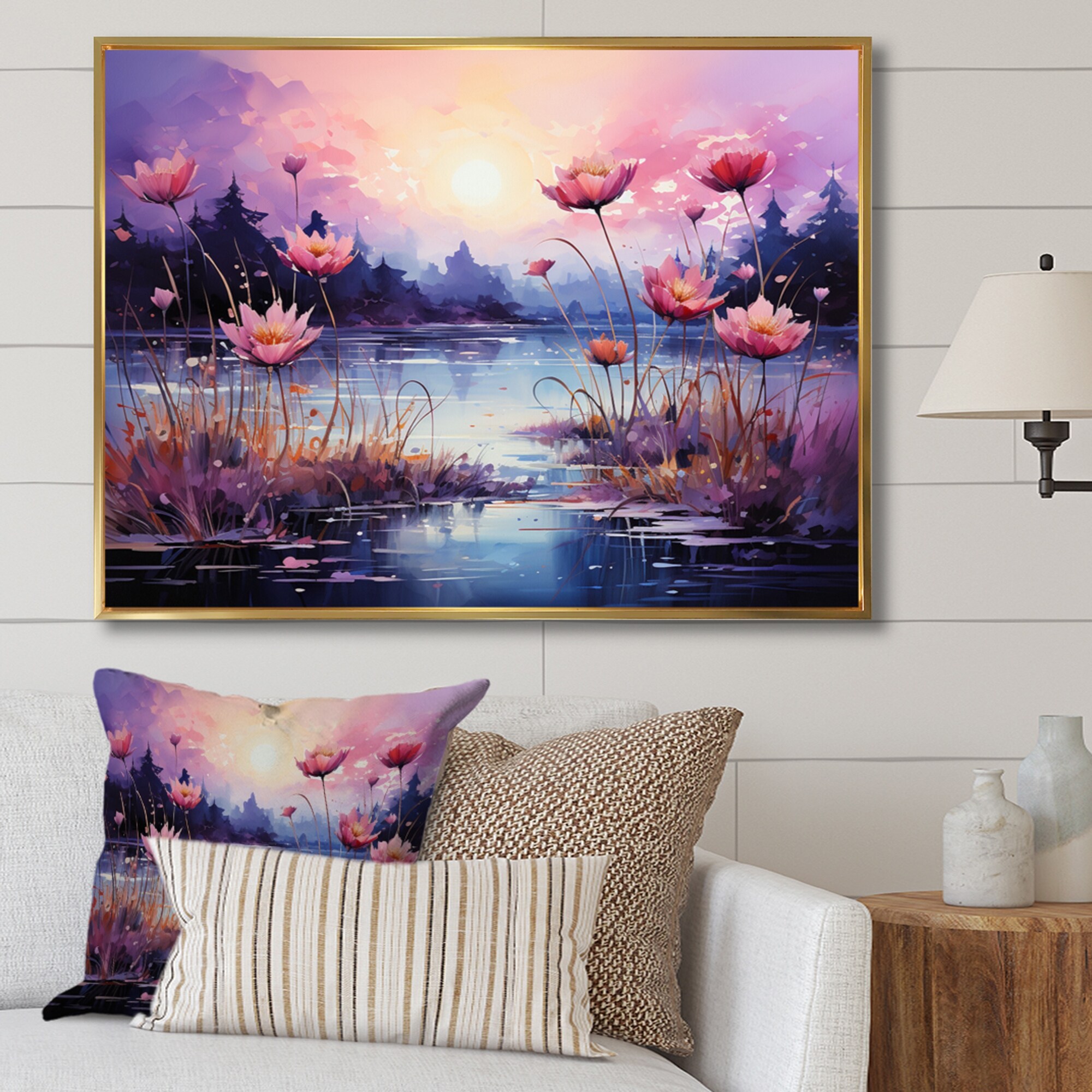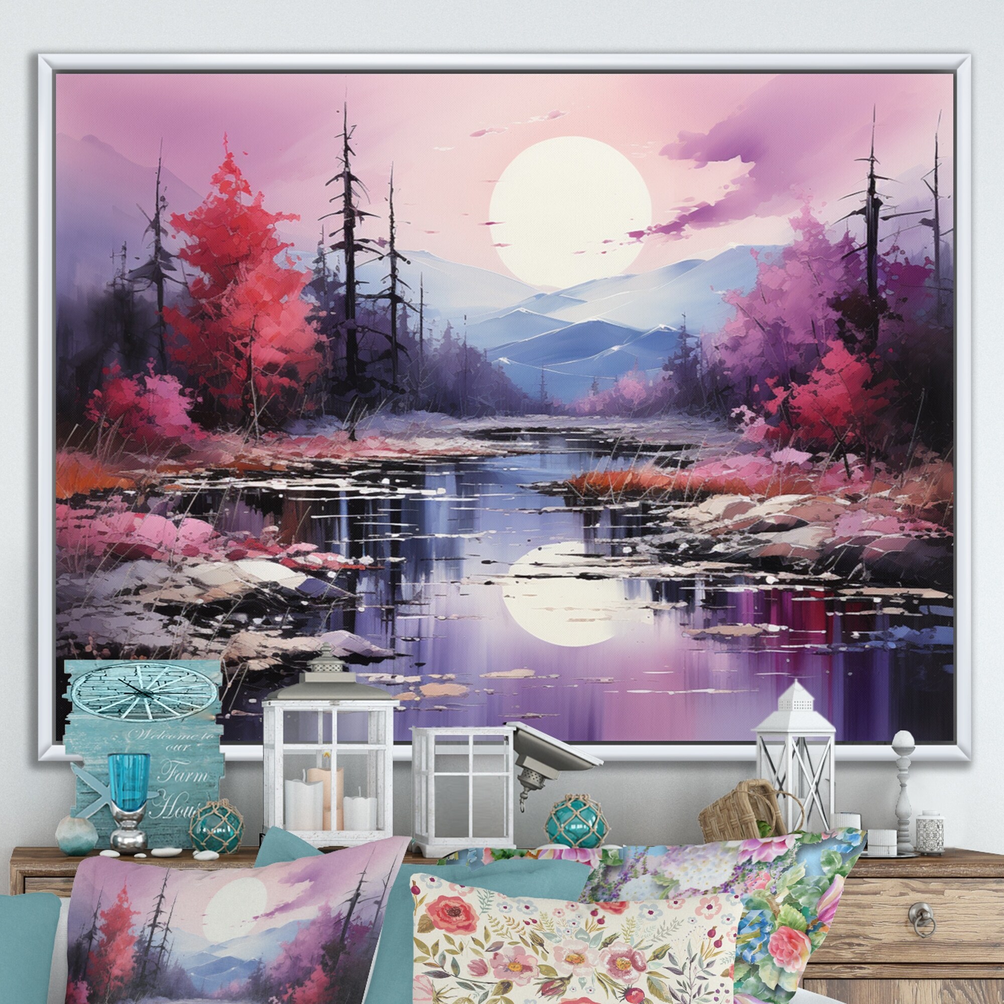 Designart "Pink Purple Riverside Serenity I" Lakes & Rivers Framed Canvas Wall Art