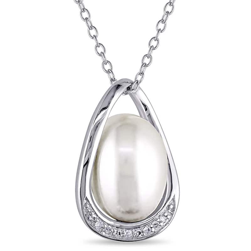 Miadora Sterling Silver Diamond and FW Pearl Necklace (9.5-10 MM)