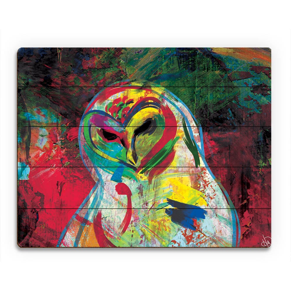 Spooky Colorful Owl on Crimson Wall Art on Wood