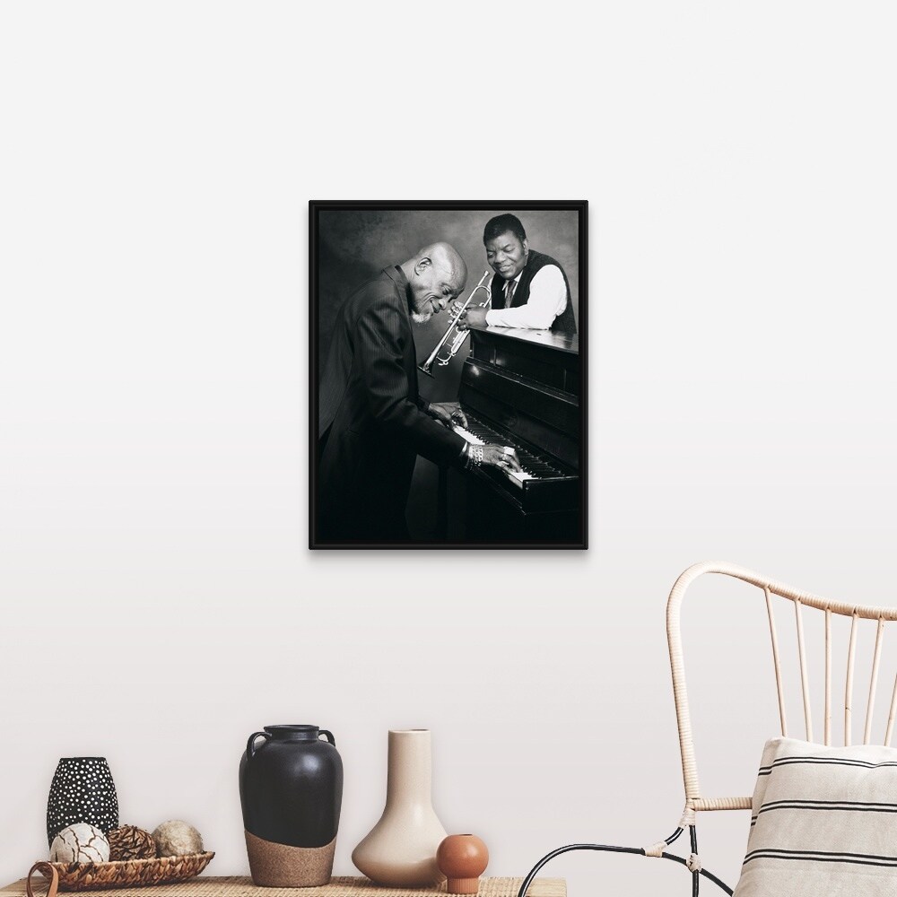 "Pianist and trumpet player talking together" Black Float Frame Canvas Art