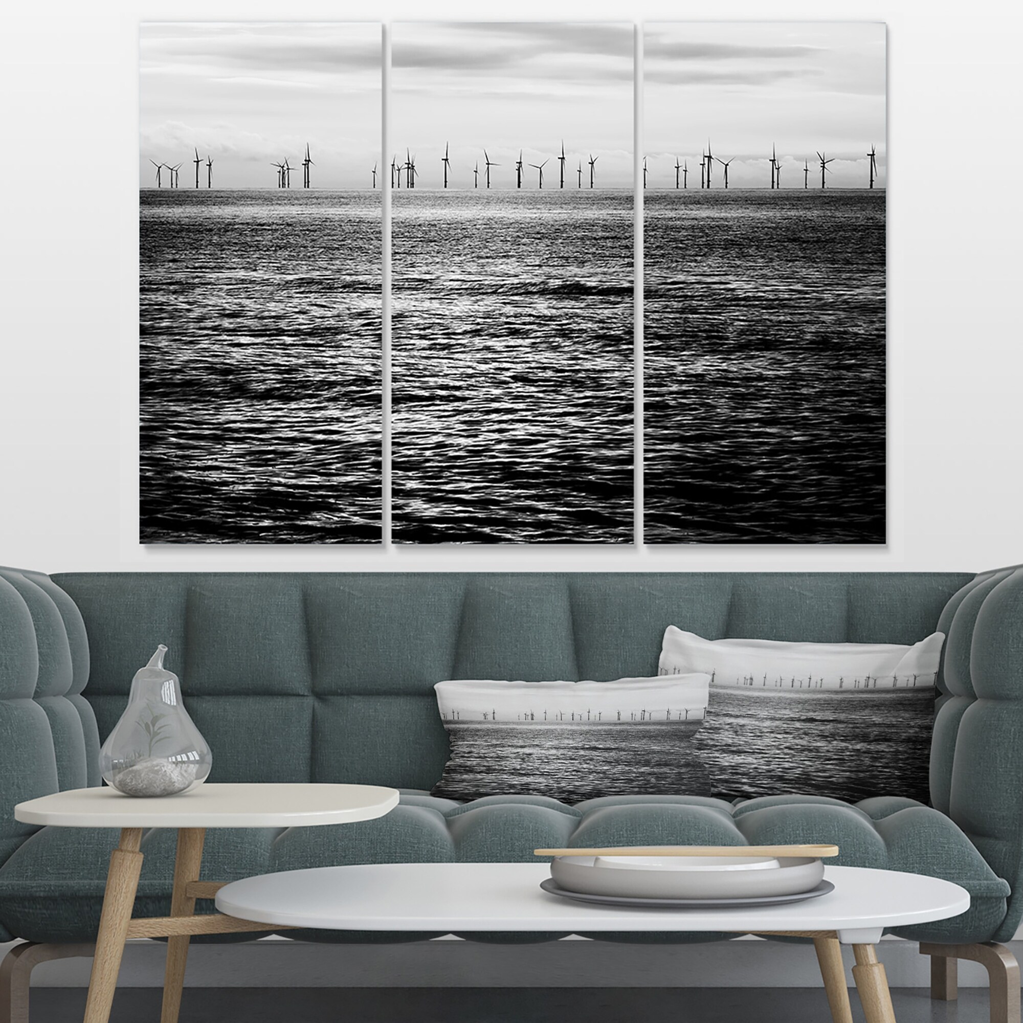 Designart "Wind Turbines Black and White" Landscape Artwork Canvas - 36x28 - 3 Panels